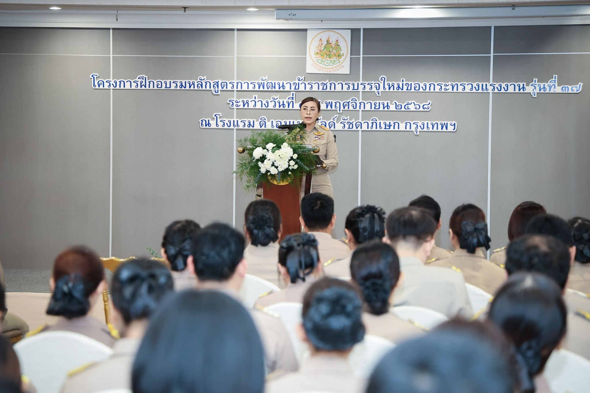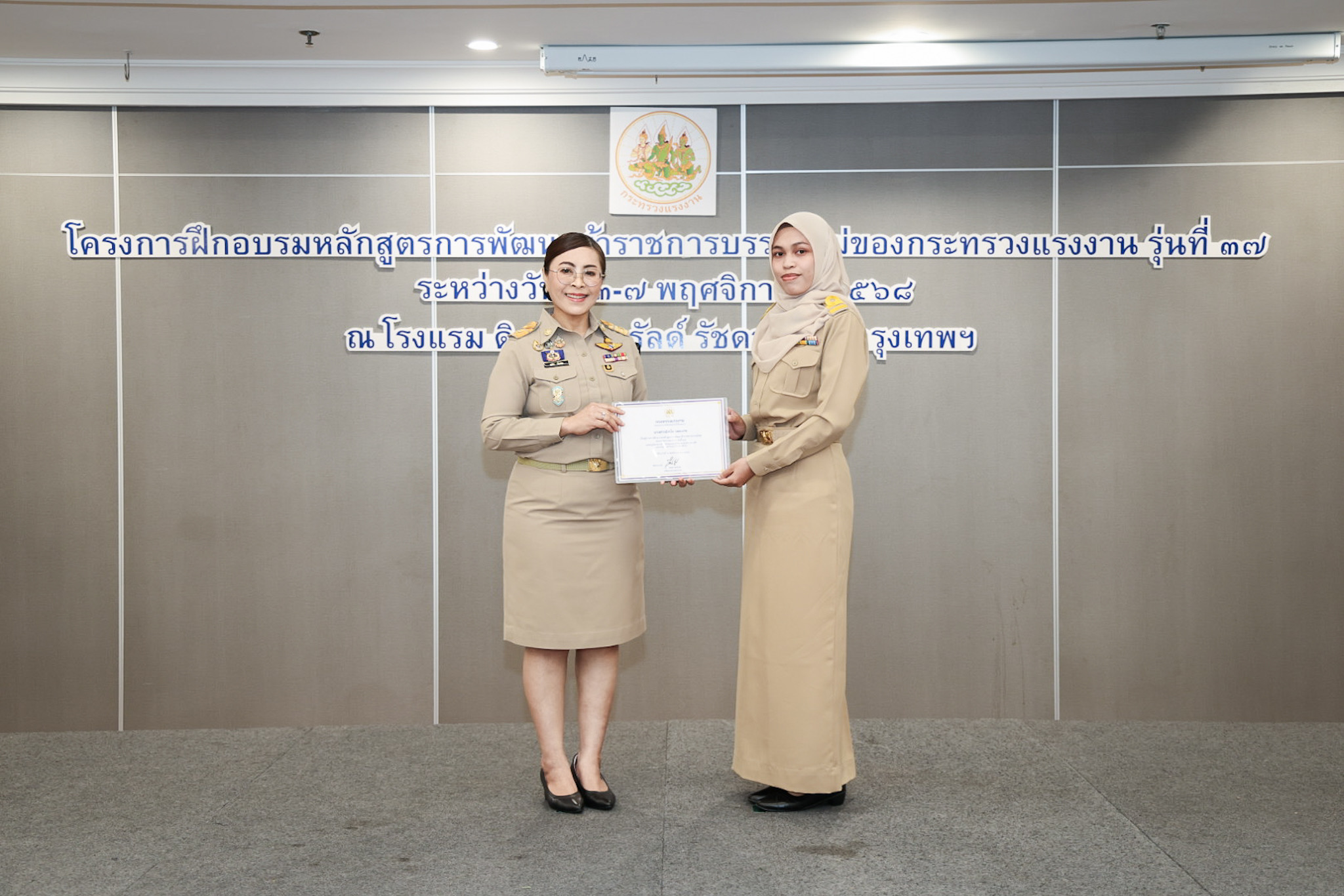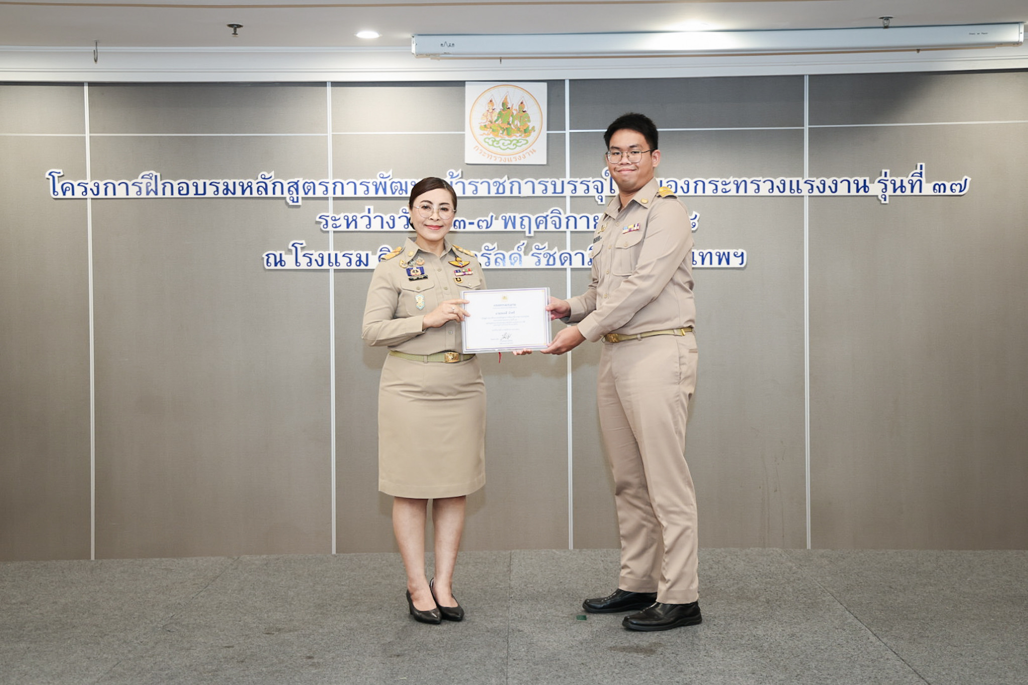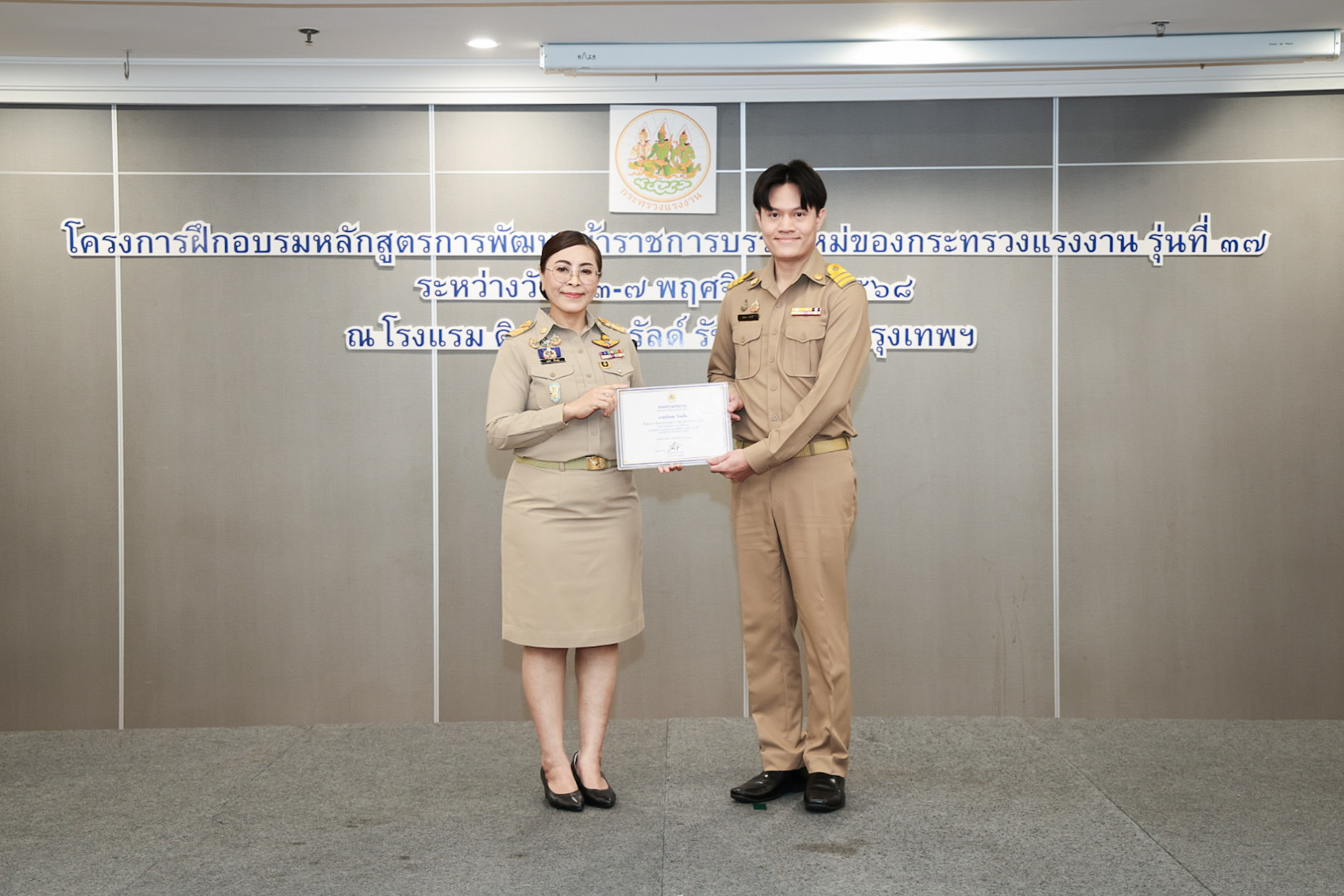 วันที่ 7 พฤศจิกายน 2568 เวลา 14.00 น. พันตำรวจโท วรรณพงษ์ คชรักษ์ ปลัดกระทรวงแรงงาน มอบหมายให้ นางสาวบุปผา เรืองสุด เลขาธิการสำนักงานประกันสังคม รักษาราชการแทน รองปลัดกระทรวงแรงงาน เป็นประธานพิธีมอบประกาศนียบัตรให้กับผู้ผ่านการฝึกอบรมและปิดโครงการฝึกอบรมหลักสูตรการพัฒนาข้าราชการบรรจุใหม่ของกระทรวงแรงงาน รุ่นที่ 37 โดยมี ว่าที่ร้อยตรี สมศักดิ์ พรหมดำ ผู้ตรวจราชการกระทรวงแรงงาน นายสิบหมื่นชัย โพธิสินธุ์ ผู้ตรวจราชการกระทรวงแรงงาน พร้อมด้วยผู้บริหารระดับสูงหน่วยงานในสังกัดกระทรวงแรงงาน เข้าร่วมด้วย ณ ห้องประชุมเพชรชมพู ชั้น 3 โรงแรมดิเอมเมอรัลด์