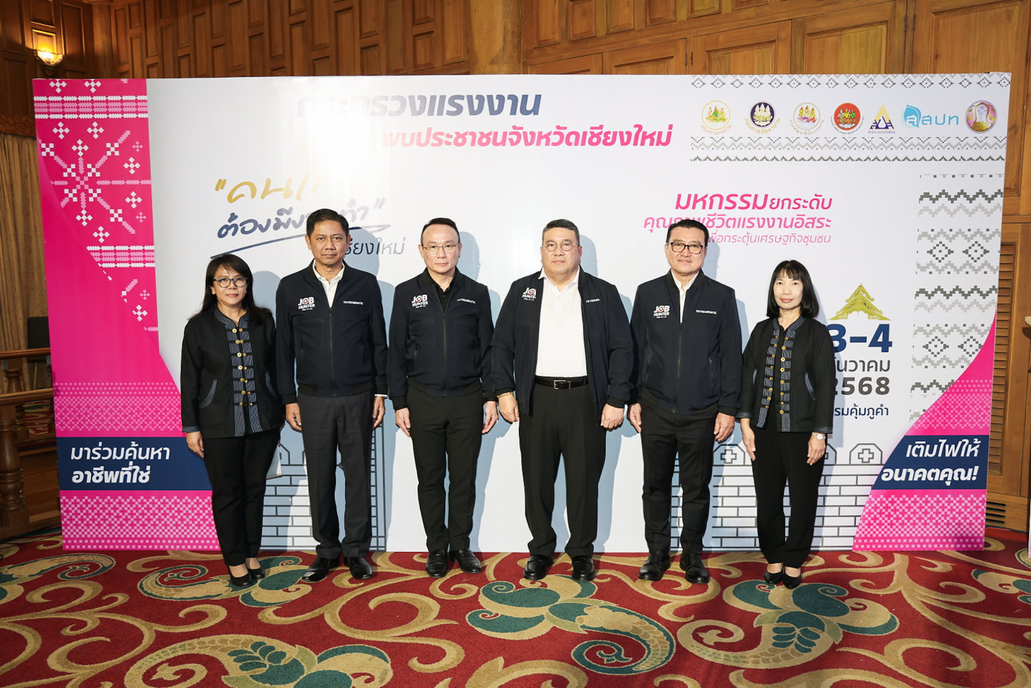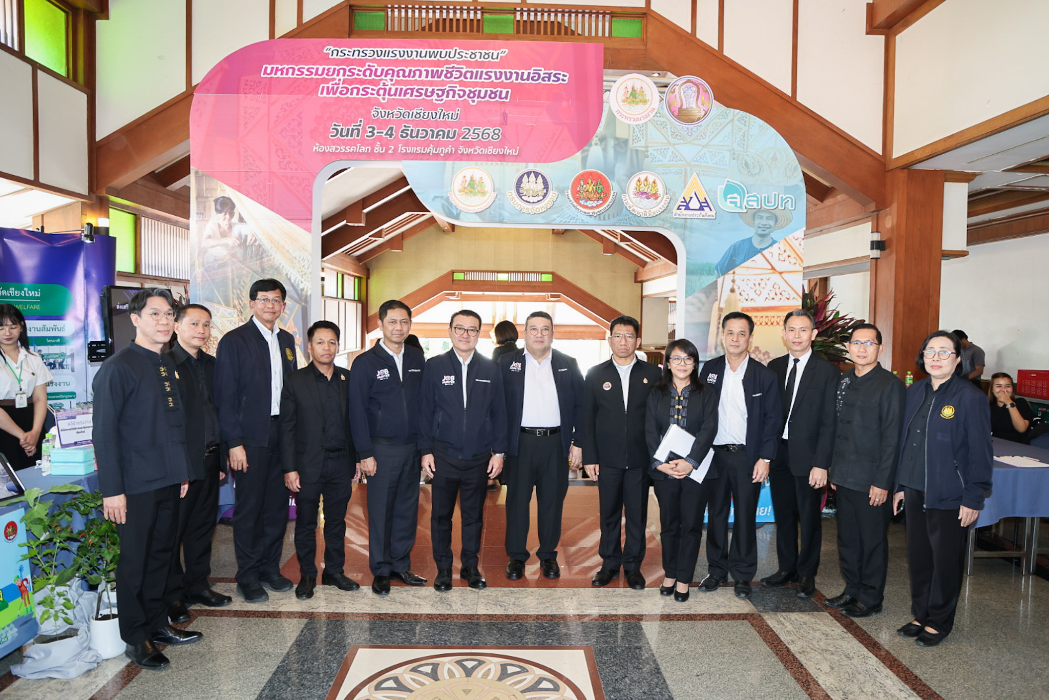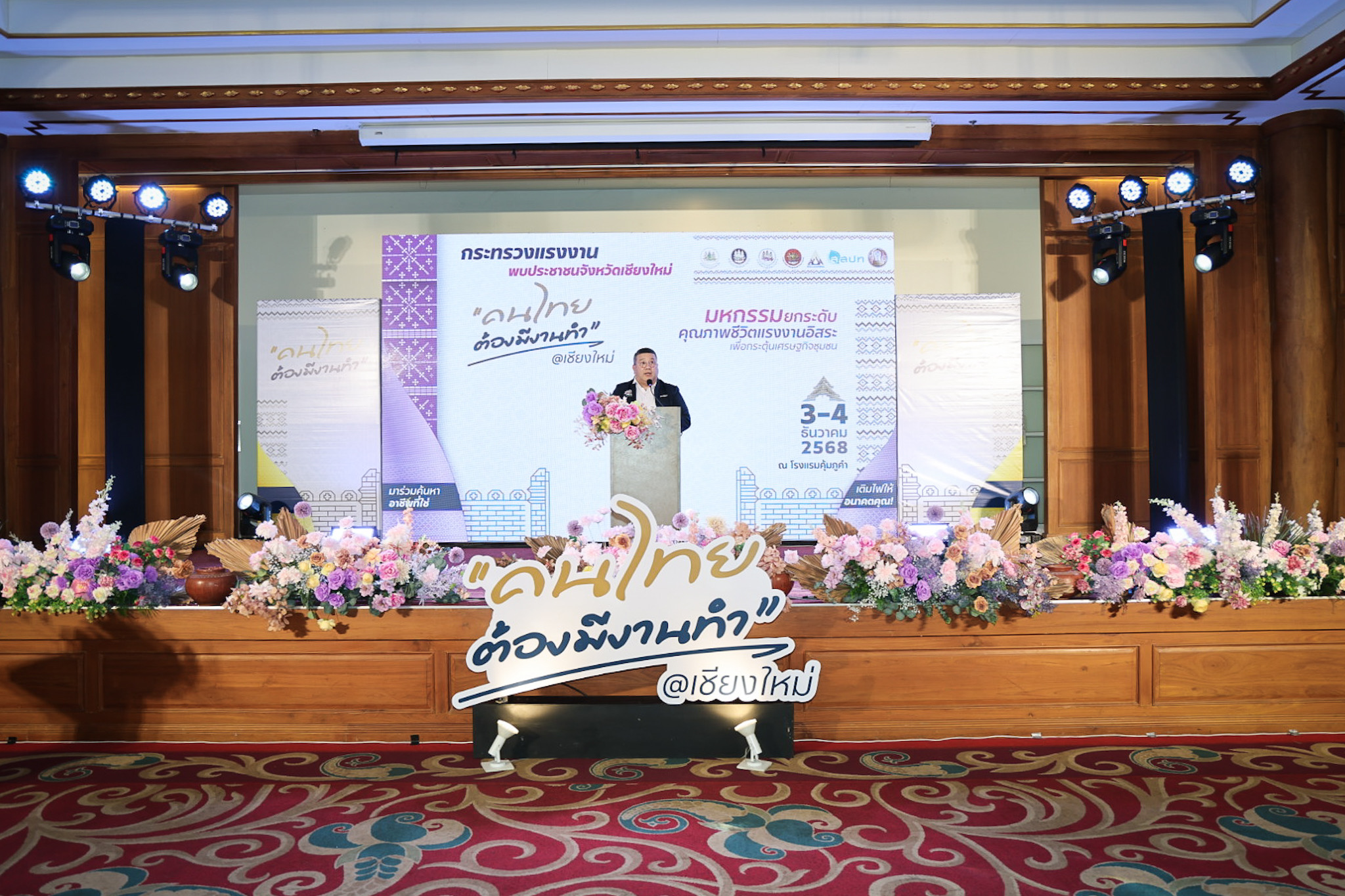 วันที่ 3 ธันวาคม 2568 เวลา 10.00 น. นางสาวตรีนุช เทียนทอง รัฐมนตรีว่าการกระทรวงแรงงาน มอบหมายให้ พันตำรวจโท วรรณพงษ์ คชรักษ์ ปลัดกระทรวงแรงงาน เป็นประธานเปิดงาน “กระทรวงแรงงานพบประชาชน” โดยมี นายชัชวาลย์ ปัญญา รองผู้ว่าราชการจังหวัดเชียงใหม่ กล่าวต้อนรับ นายพิเชษฐ์ ทองพันธ์ รองปลัดกระทรวงแรงงาน กล่าวรายงาน นายสันติ นันตสุวรรณ รองปลัดกระทรวงแรงงาน ว่าที่ร้อยตรี สมศักดิ์ พรหมดำ ผู้ตรวจราชการกระทรวงแรงงาน นายสิบหมื่นชัย โพธิสินธุ์ ผู้ตรวจราชการกระทรวงแรงงาน หัวหน้าส่วนราชการ และหน่วยงานที่เกี่ยวข้อง เข้าร่วมด้วย ณ ห้องเรือนคุ้ม โรงแรมคุ้มภูคำ จังหวัดเชียงใหม่
