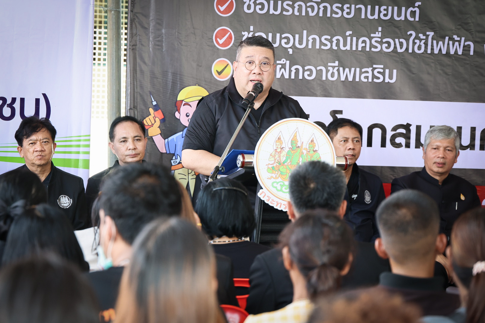 พันตำรวจโท วรรณพงษ์ คชรักษ์ ปลัดกระทรวงแรงงาน เปิดเผยว่า กิจกรรม “ซ่อม สร้างสุข สร้างคนให้งาน” มีจุดเริ่มต้นจากสถานการณ์อุทกภัยในพื้นที่ภาคใต้เมื่อเดือนพฤศจิกายนที่ผ่านมา ซึ่งได้สร้างผลกระทบอย่างรุนแรงต่อพี่น้องประชาชนเป็นวงกว้าง โดยเฉพาะแรงงานอิสระที่ต้องเผชิญกับการสูญเสียเครื่องมือประกอบอาชีพและรายได้ในทันที กระทรวงแรงงานตระหนักถึงความเดือดร้อนดังกล่าว และยึดมั่นในหลักการว่า จะไม่ทอดทิ้งคนไทยในทุกสถานการณ์ จึงได้มอบหมายให้กรมพัฒนาฝีมือแรงงานจัดตั้ง “โรงครัวกระทรวงแรงงาน” เพื่อเร่งส่งต่อข้าวกล่องและอาหารปรุงสุกแก่ผู้ประสบภัยในช่วงเวลาวิกฤตอย่างทันท่วงที เมื่อสถานการณ์เริ่มคลี่คลาย กระทรวงแรงงานได้มีมาตรการฟื้นฟู โดยได้ระดมช่างอาสากว่า 100 คน เจ้าหน้าที่กรมพัฒนาฝีมือแรงงาน และพันธมิตร ลงพื้นที่ดูแลบรรเทาความเดือดร้อนของแรงงานอย่างต่อเนื่อง ผ่านมาตรการฟื้นฟูเร่งด่วนภายใต้ศูนย์ “ซ่อม สร้าง สุข” ทั้ง 9 จังหวัดภาคใต้ ด้วยการซ่อมแซมเครื่องมือและอุปกรณ์ที่ใช้ในการประกอบอาชีพ เพื่อช่วยลดภาระค่าใช้จ่ายของประชาชน และเข้าสู่กิจกรรม “ซ่อม สร้าง สุข สร้างคนให้งาน” โดยสถาบันพัฒนาฝีมือแรงงาน 12 สงขลา เพื่อเปิดโอกาสให้พี่น้องแรงงาน โดยเฉพาะแรงงานอิสระ เข้ารับการฝึกอบรมในหลักสูตรอาชีพต่าง ๆ ของกรมพัฒนาฝีมือแรงงาน เพื่อเสริมสร้างทักษะ เพิ่มพูนความรู้ และต่อยอดสู่อาชีพที่มั่นคง อันจะนำไปสู่การ “สร้างงาน” ให้แรงงานสามารถกลับมาทำงานได้อย่างรวดเร็ว มีรายได้เลี้ยงดูครอบครัว และยืนหยัดพึ่งพาตนเองได้อย่างเข้มแข็งอีกครั้ง ผลลัพธ์ที่ตามมาคือ “สุข” ที่เกิดขึ้นกับแรงงานและครอบครัว ซึ่งถือเป็นเป้าหมายสูงสุดของกระทรวงแรงงาน ความตั้งใจทั้งหมดนี้สะท้อนถึงภารกิจของกระทรวงแรงงานในการยืนหยัดอยู่เคียงข้างประชาชนในทุกช่วงเวลา และจะไม่หยุดทำงานจนกว่าพี่น้องแรงงานทุกคนจะสามารถกลับมาใช้ชีวิตได้อย่างปกติ มั่นคง และภาคภูมิใจในศักดิ์ศรีของตนเองอีกครั้ง