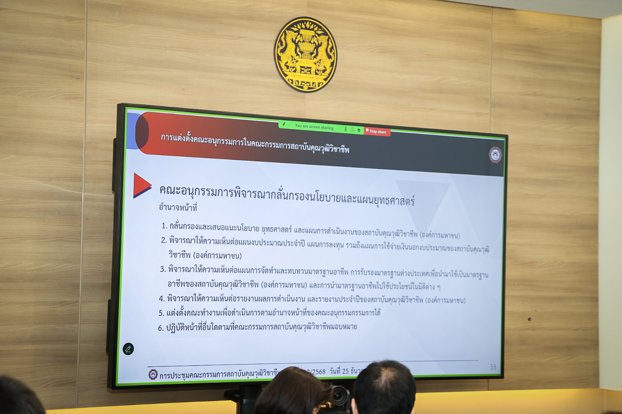 สำหรับการประชุมดังกล่าว ที่ประชุมได้พิจารณา อาทิ (ร่าง) คำสั่งแต่งตั้งที่ปรึกษาคณะกรรมการ คณะกรรมการตรวจสอบภายในและคณะอนุกรรมการต่างๆ แผนปรับปรุงการปฏิบัติงานและพัฒนาคุณภาพการให้บริการ ประจำปีงบประมาณ พ.ศ. 2569 รายงานผลการดำเนินงานตามบันทึกข้อตกลงการประเมินความคุ้มค่า เพื่อพัฒนาองค์การมหาชน พ.ศ. 2566 – 2568 การเพิกถอนสถานะการเป็นองค์กรที่มีหน้าที่รับรองสมรรถนะของบุคคลตามมาตรฐานอาชีพ ขอรับรองผลการทบทวนมาตรฐานอาชีพ จำนวน 1 อาชีพ และผลการทบทวนสมรรถนะสนับสนุนการทำงาน จำนวน 1 สมรรถนะสนับสนุนการทำงาน ขอรับรององค์กรที่มีหน้าที่รับรองสมรรถนะของบุคคลตามมาตรฐานอาชีพ จำนวน 5 องค์กร เป็นต้น
