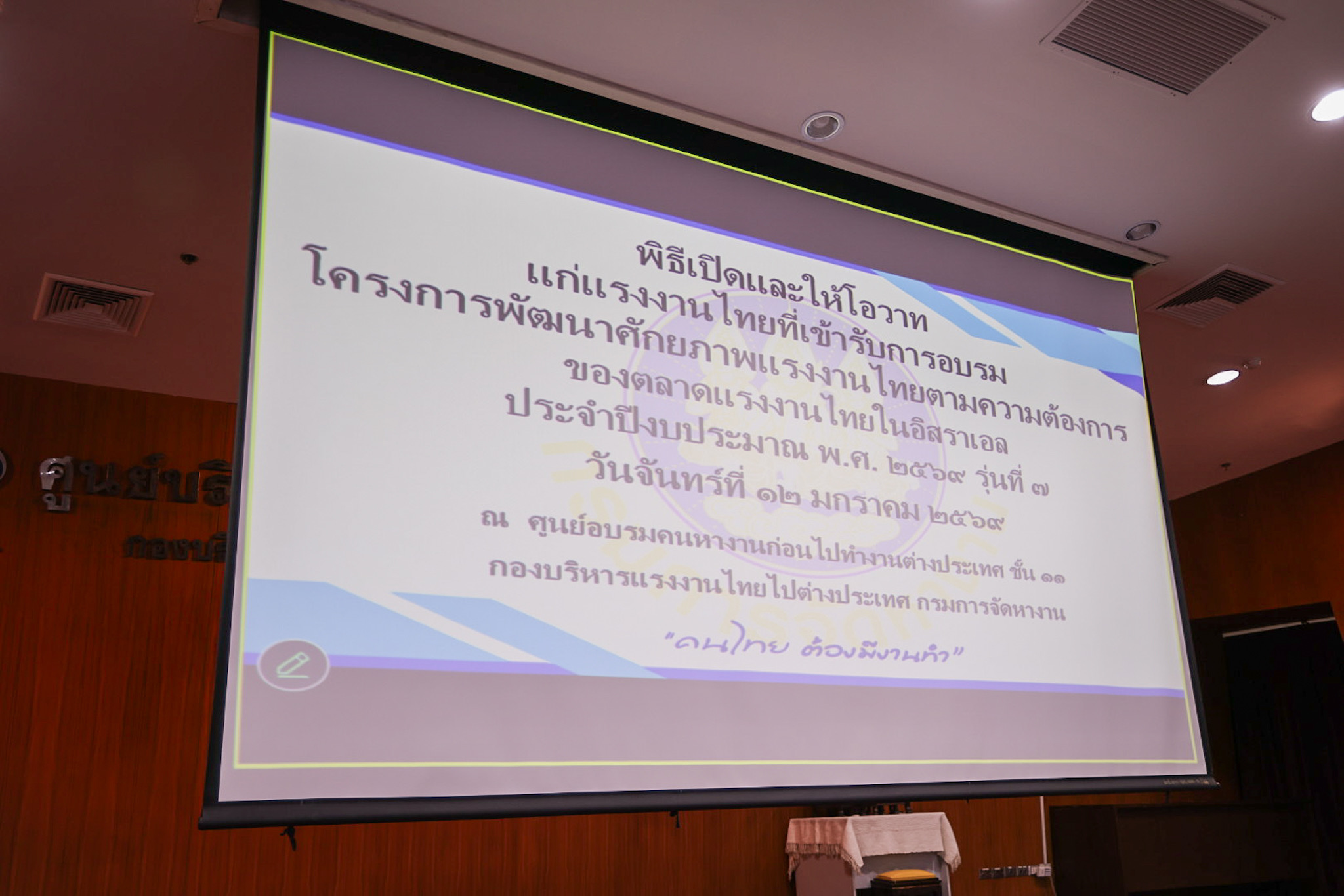 สำหรับการจัดฝึกอบรมในครั้งนี้ จัดขึ้นโดยกรมการจัดหางาน กระทรวงแรงงาน เพื่อให้แรงงานไทยได้พัฒนาทักษะที่จำเป็นและเตรียมความพร้อมก่อนเดินทางไปทำงานในรัฐอิสราเอล โดยมุ่งเน้นทักษะปฏิบัติจริงด้านภาษาฮิบรูขั้นพื้นฐาน ด้านการทำงานภาคเกษตร การใช้อุปกรณ์เครื่องมือเทคนิคการเกษตรสมัยใหม่ การใช้ชีวิตและการปรับตัวในต่างประเทศ มีกำหนดการฝึกอบรมเป็นเวลา 3 วัน ระหว่างวันที่ 12 – 14 มกราคม 2569 มีผู้เข้ารับการอบรมทั้งสิ้นจำนวน 400 คน