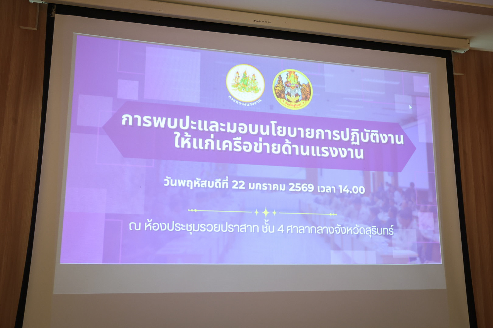 วันที่ 22 มกราคม 2569 เวลา 13.30 น. พันตำรวจโท วรรณพงษ์ คชรักษ์ ปลัดกระทรวงแรงงาน เป็นประธานการประชุมและมอบแนวคิดในการปฏิบัติงานให้แก่หัวหน้าส่วนราชการในสังกัดกระทรวงแรงงานจังหวัดสุรินทร์ พร้อมพบปะและมอบนโยบายการปฏิบัติงานให้แก่เครือข่ายด้านแรงงาน อาสาสมัครแรงงาน จำนวน 20 คน และบัณฑิตแรงงาน จำนวน 6 คน โดยมี นายกิตติ สัตย์ซื่อ รองผู้ว่าราชการจังหวัดสุรินทร์ กล่าวต้อนรับ ว่าที่ร้อยตรี สมศักดิ์ พรหมดำ ผู้ตรวจราชการกระทรวงแรงงาน เข้าร่วมประชุมด้วย ณ ห้องประชุมรวยปราสาท ชั้น 4 ศาลากลางจังหวัดสุรินทร์ อ.เมืองสุรินทร์ จ.สุรินทร์