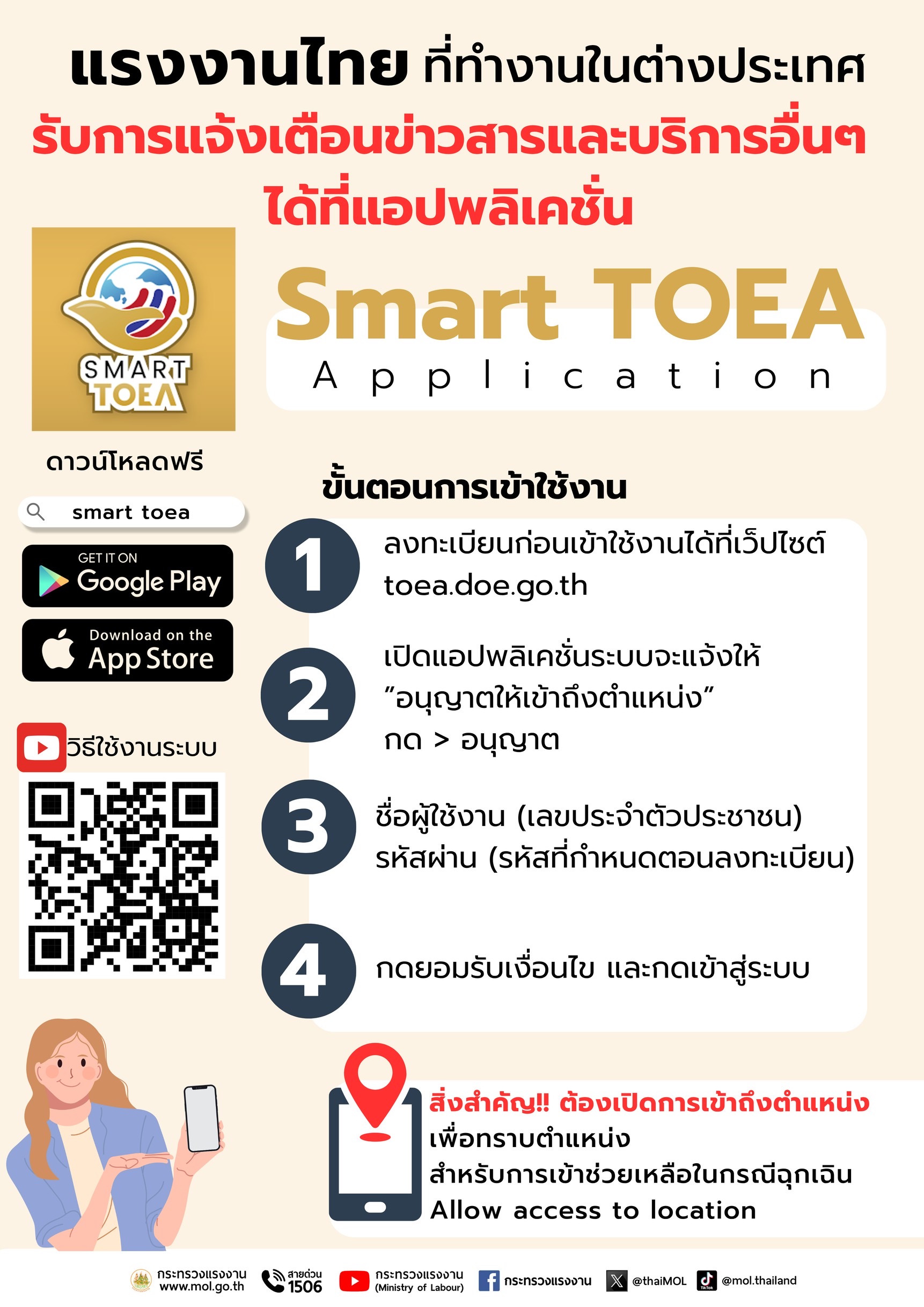 วันที่ 6 มีนาคม 2569 เวลา 18.00 น. นายสันติ นันตสุวรรณ รองปลัดกระทรวงแรงงานและโฆษกกระทรวงแรงงาน ให้สัมภาษณ์ผู้สื่อข่าวสำนักข่าวไทย สถานีโทรทัศน์ ช่อง 9 MCOT HD หมายเลข 30 ประเด็นการใช้งานระบบ Application SMART TOEA เพื่อแจ้งข้อมูลและติดตามพิกัดตำแหน่งของแรงงานไทยในภูมิภาคตะวันออกกลาง ณ บริเวณทำเนียบรัฐบาล ทั้งนี้ เนื่องจากแรงงานบางส่วนอาจยังไม่ได้อัปเดตหรือยกเลิกการติดตั้ง Application SMART TOEA ทำให้ไม่สามารถทราบพิกัดตำแหน่งได้ กระทรวงแรงงานจึงมอบหมายให้สำนักงานแรงงานจังหวัดและหน่วยงานในสังกัดทั่วประเทศ ลงพื้นที่เยี่ยมครอบครัวแรงงานไทยในภูมิภาคตะวันออกกลาง เพื่อสร้างการรับรู้ ให้กำลังใจ และประชาสัมพันธ์ให้แรงงานไทยดาวน์โหลดและเปิดใช้งาน Application SMART TOEA หากเกิดเหตุฉุกเฉินสามารถเข้าช่วยเหลือได้อย่างทันท่วงที