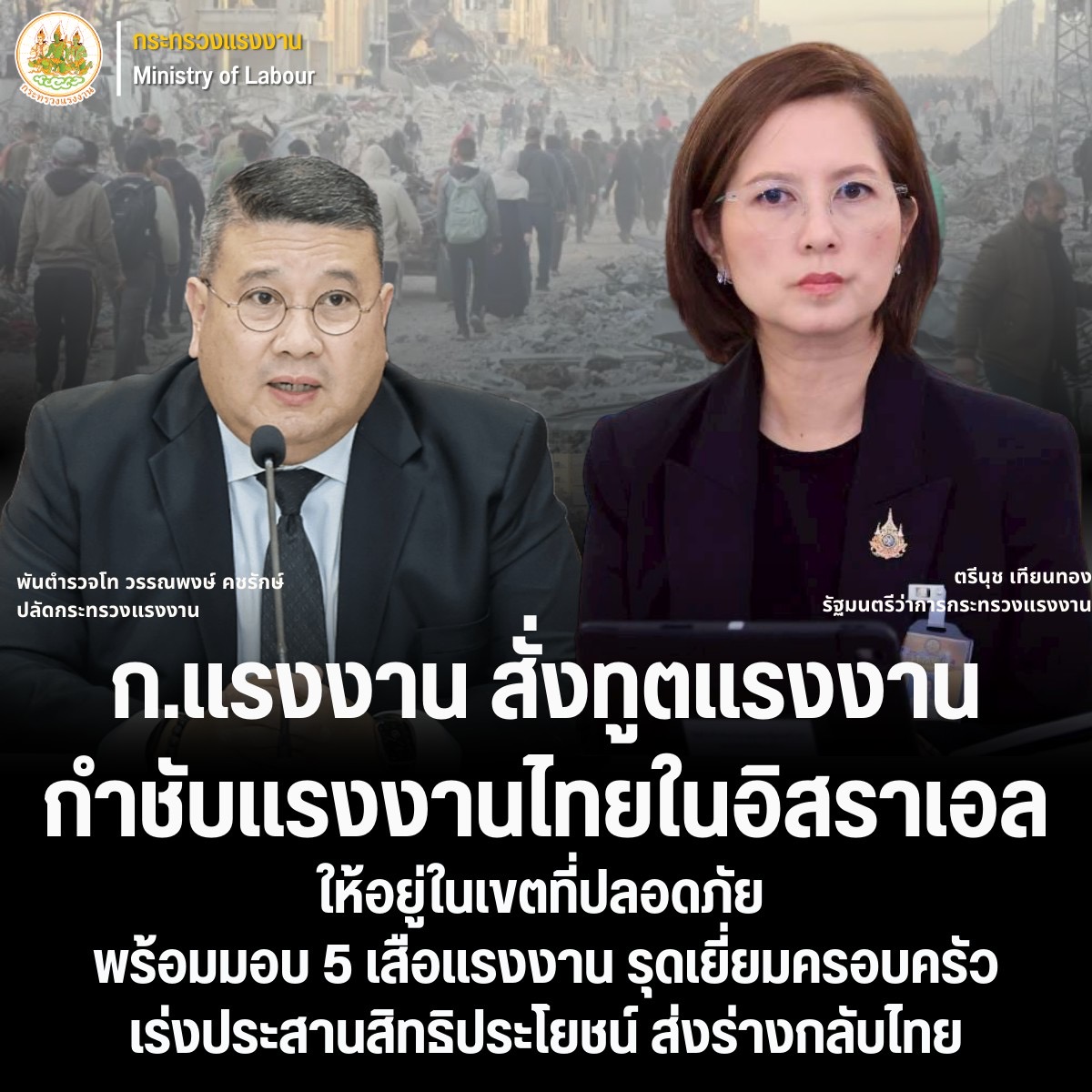 วันที่ 19 มีนาคม 2569 นางสาวตรีนุช เทียนทอง รัฐมนตรีว่าการกระทรวงแรงงาน เปิดเผยภายหลังได้รับรายงานจากฝ่ายแรงงานประจำสถานเอกอัครราชทูต ณ กรุงเทลอาวีฟ อิสราเอล โดยสถานเอกอัครราชทูต ณ กรุงเทลอาวีฟ ได้รับแจ้งยืนยันจากทางการอิสราเอล พบแรงงานไทยเสียชีวิตจากระเบิดลูกปราย โดยผู้เสียชีวิต คือ นายชัยวัฒน์ แววนิล อายุประมาณ 30 ปี มีภูมิลำเนาอยู่ที่จังหวัดชัยภูมิ โดยเสียชีวิตเมื่อเวลา 23.45 น. ของวันที่ 18 มีนาคมที่ผ่านมา ว่า ได้สั่งการให้ทูตแรงงาน ในอิสราเอล ให้การดูแลและกำชับแรงงานไทยที่ยังคงทำงานในอิสราเอลให้อยู่ในเขตที่ปลอดภัย และปฏิบัติตามคำแนะนำของเจ้าหน้าที่อย่างเคร่งครัด หลังเกิดเหตุการณ์แรงงานไทยเสียชีวิตในครั้งนี้ รวมทั้งให้ฝ่ายแรงงานประจำสถานเอกอัครราชทูต ณ กรุงเทลอาวีฟ เร่งประสานความช่วยเหลือกับทางสถานเอกอัครราชทูตอย่างใกล้ชิด เพื่ออำนวยความสะดวกในการติดตามสิทธิประโยชน์ต่างๆ ของแรงงานที่เสียชีวิต รวมถึงการเตรียมการนำร่างกลับประเทศไทย