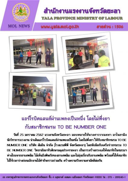 เมื่อวันที่ 25 มกราคม 2562 แรงงานจังหวัดยะลา นางสาวมาลี ขวัญเจริญ มอบหมายให้นางสาววาเนสสา มาโนยามิง นักวิชาการแรงงาน นำเต้นแอร์โรบิคแด้นส์ ครั้งที่ 1 ผ่านเพลงเป็นหนึ่ง โดยไม่พึ่งยาเสพติด ให้กับบริษัท คัมอิน จำกัด (โรงแรมพีพี จังหวัดยะลา) โดยจับมือกับเครือข่ายชมรม TO BE NUMBER ONE วิทยาลัยอาชีวศึกษาผดุงประชายะลา เป็นการสร้างกระแส การสร้างความใกล้ชิด ความสามัคคี และให้สมาชิกรักสุขภาพ โดยให้ใช้เวลาว่างให้เกิดประโยชน์ ห่างไกลจากยาเสพติด