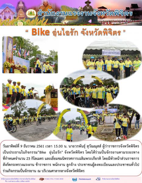 วันอาทิตย์ที่ 9 ธันวาคม 2561 เวลา 15.00 น. นายวรพันธุ์ สุวัณณุสส์ ผู้ว่าราชการจังหวัดพิจิตร เป็นประธานในกิจกรรม"Bike อุ่นไอรัก" จังหวัดพิจิตร โดยได้ร่วมปั่นจักรยานตามระยะทางที่กำหนดจำนวน 23 กิโลเมตร และเยี่ยมชมนิทรรศการเฉลิมพระเกียรติ โดยมีหัวหน้าส่วนราชการสังกัดกระทรวงแรงงาน ข้าราชการ พนักงาน ลูกจ้าง ประชาชนผู้ลงทะเบียนและประชาชนทั่วไปร่วมกิจกรรมปั่นจักรยาน ณ บริเวณศาลากลางจังหวัดพิจิตร