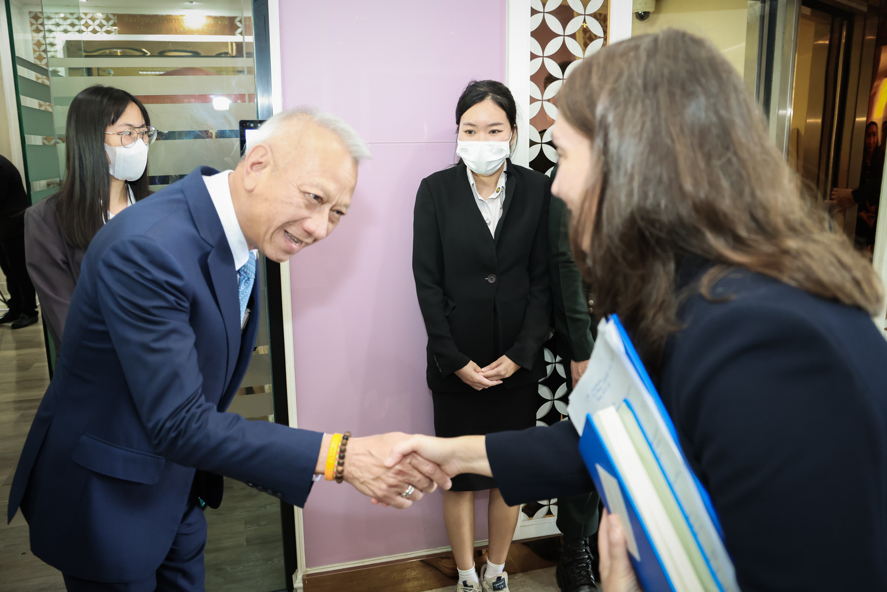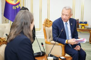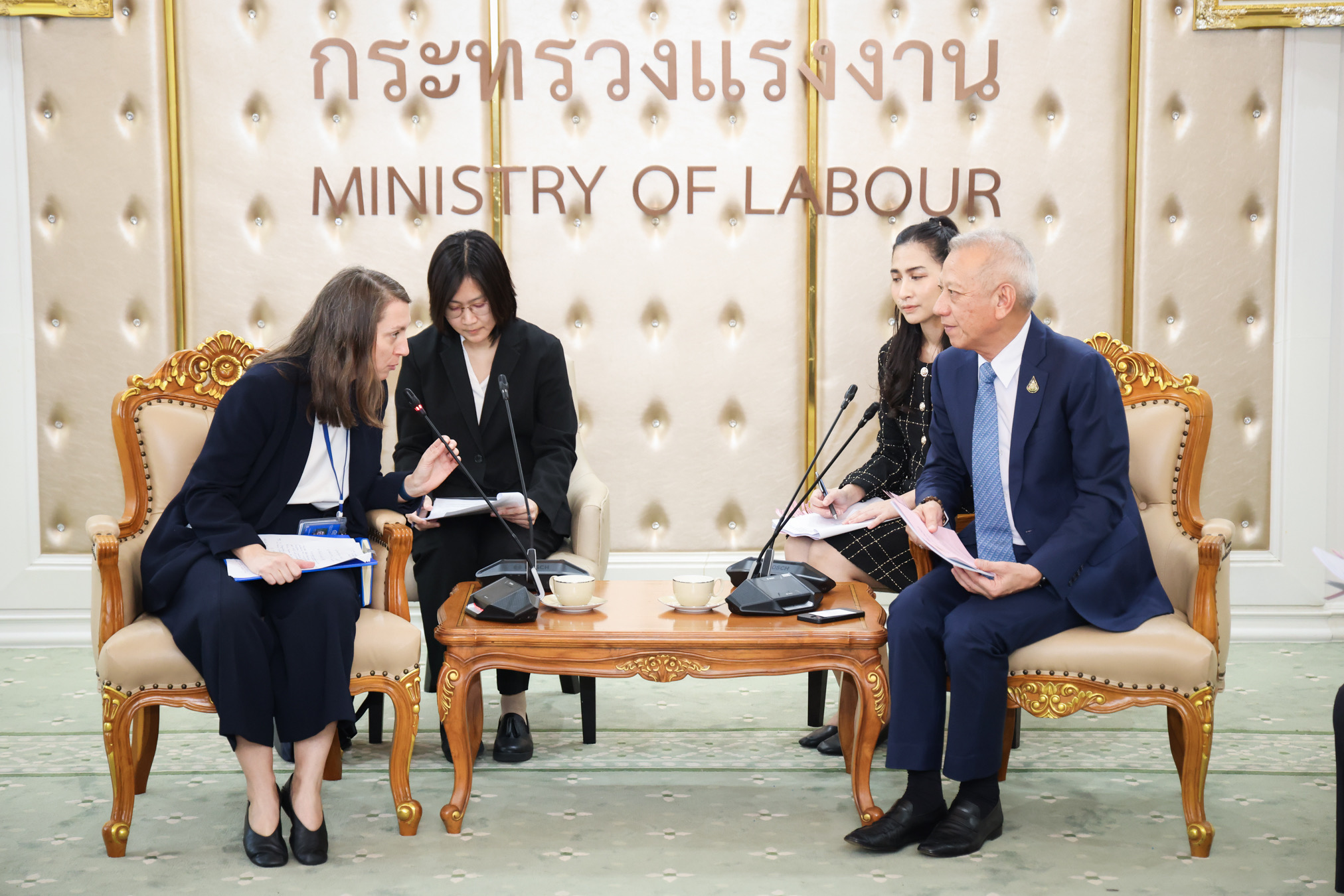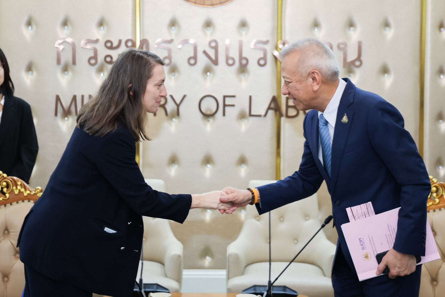 ด้าน นางสาวเจอรัลดีน อองซาร์ค (Ms. Geraldine Ansart) หัวหน้าสำนักงานองค์การระหว่างประเทศเพื่อการโยกย้ายถิ่นฐาน (International Organization for Migration: IOM) กล่าวว่า ขอขอบคุณรัฐมนตรีว่าการกระทรวงแรงงาน ที่เปิดโอกาสให้คณะ IOM ได้เข้าพบเพื่อหารือในวันนี้ IOM ประทับใจในการยึดหลักสิทธิมนุษยชนแก่แรงงานข้ามชาติของท่านรัฐมนตรีว่าการกระทรวงแรงงานและชื่นชมการปฏิบัติต่อแรงงานข้ามชาติของรัฐบาลไทย ที่สามารถเป็นต้นแบบที่ดีให้กับหลายๆ ประเทศได้ โดยเฉพาะในการดูแลและส่งเสริมสุขภาพของแรงงานข้ามชาติให้มีหลักประกันสังคม อย่างไรก็ตาม จากการหารือในวันนี้เราพร้อมสนับสนุนข้อมูลและประสานการทำงานกับกระทรวงแรงงานอย่างใกล้ชิดยิ่งขึ้น ซึ่งที่ผ่านมา IOM ได้ร่วมมือกับองค์กรภาครัฐ เอกชน สมาคมต่างๆ หลายองค์กรในประเทศไทย เพื่อพัฒนาทักษะการทำงานให้แรงงานข้ามชาติ ขณะเดียวกันก็พร้อมสนับสนุนช่วยเหลือแรงงานไทยให้การไปทำงานต่างประเทศของแรงงานไทยเป็นการโยกย้านถิ่นฐานที่ปลอดภัยด้วยเช่นกัน