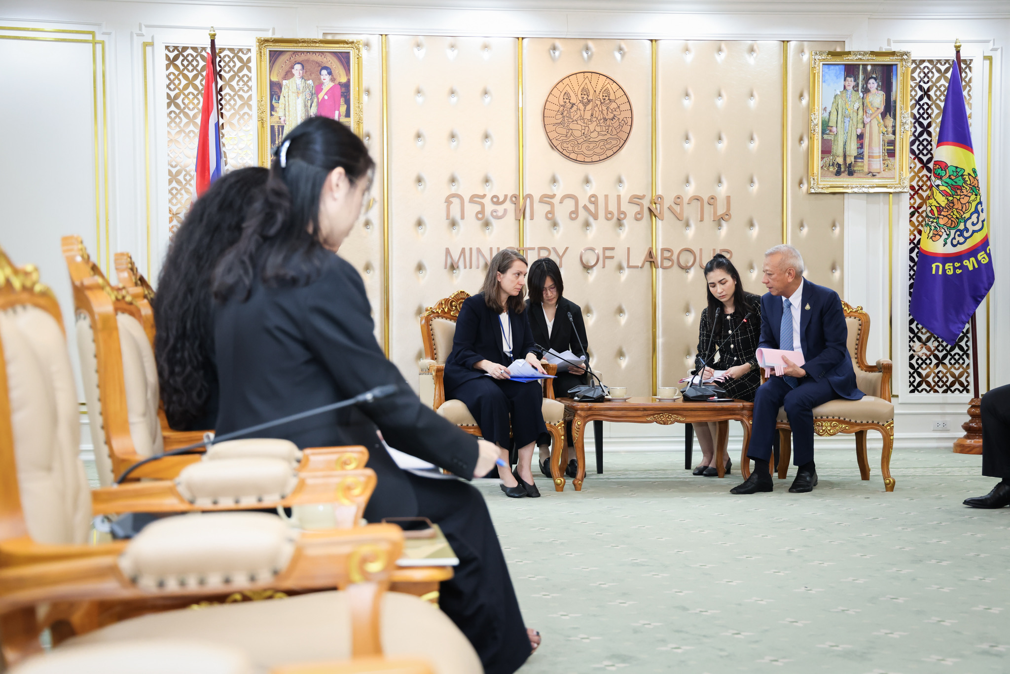 วันที่ 6 มีนาคม 2567 เวลา 13.30 น. นายพิพัฒน์ รัชกิจประการ รัฐมนตรีว่าการกระทรวงแรงงาน ให้การต้อนรับ นางสาวเจอรัลดีน อองซาร์ค (Ms. Geraldine Ansart) หัวหน้าสำนักงานองค์การระหว่างประเทศเพื่อการโยกย้ายถิ่นฐาน (International Organization for Migration: IOM) และคณะผู้แทนจาก IOM ประจำประเทศไทยในโอกาสเข้าพบเพื่อเยี่ยมคารวะและหารือแลกเปลี่ยนข้อมูลเกี่ยวกับนโยบายหรือโครงการที่กระทรวงแรงงานให้ความสำคัญในปี พ.ศ. 2567 เกี่ยวกับการโยกย้ายถิ่นฐานของแรงงานข้ามชาติในประเทศไทยและแรงงานไทยที่ไปทำงานในต่างประเทศ ตลอดจนความร่วมมือในการเคลื่อนย้ายแรงงานทักษะ และการดำเนินงานว่าด้วยการโยกย้ายถิ่นฐานธุรกิจกับสิทธิมนุษยชน ตลอกจนหารือแนวทางความร่วมมือระหว่าง IOM กับกระทรวงแรงงาน ในปี 2567 โดยมี นายสิรภพ ดวงสอดศรี ผู้ช่วยรัฐมนตรีประจำกระทรวงแรงงาน นายอารี ไกรนรา เลขานุการรัฐมนตรีว่าการกระทรวงแรงงาน นายภุชงค์ วรศรี ประจำสำนักเลขาธิการนายกรัฐมนตรี ปฏิบัติหน้าที่ประจำกระทรวงแรงงาน นายสมาสภ์ ปัทมะสุคนธ์ ผู้ตรวจราชการกระทรวงแรงงาน พร้อมด้วย ผู้บริหารระดับสูงกระทรวงแรงงาน เข้าร่วม ณ ห้องจัตุมงคล ชั้น 6 อาคารกระทรวงแรงงาน