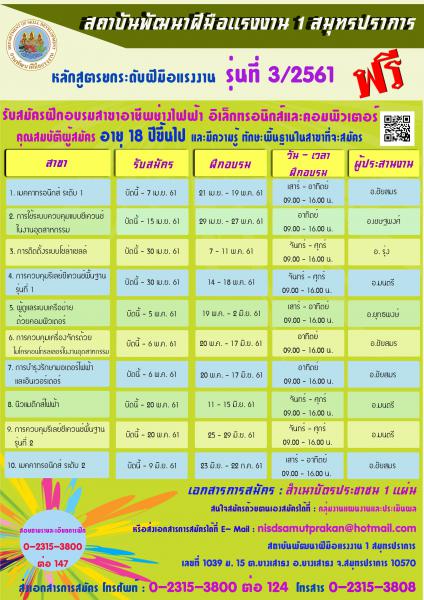 สถาบันพัฒนาฝีมือแรงงาน 1 สมุทรปราการ รับสมัครฝึกอบรมหลักสูตรยกระดับฝีมือแรงงาน รุ่นที่ 3/2561 ฟรี