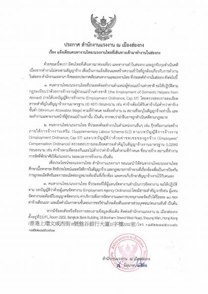 ประกาศสำนักงานแรงงาน ณ เเมืองฮ่องกง เรื่อง แจ้งเตือนคนหางานไทย / แรงงานไทยที่เดินเข้ามาหางานทำในฮ่องกง