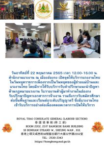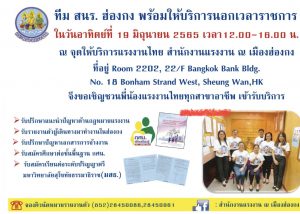 สำนักงานแรงงาน ณ เมืองฮ่องกง เปิดจุดให้บริการแรงงานไทยในวันหยุดราชการ เนื่องจากเป็นวันหยุดของผู้ช่วยแม่บ้านและแรงงานไทย
