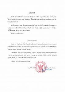 สำนักงานแรงงาน ณ เมืองฮ่องกง ขอแจ้งปรับเวลาให้บริการ