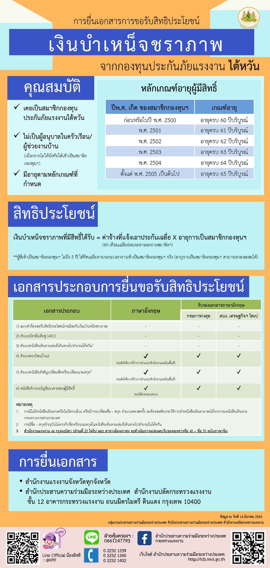 ประชาสัมพันธ์การยื่นเอกสารการขอรับสิทธิประโยชน์ เงินบำเหน็จชราภาพ จากกองทุนประกันภัยแรงงาน “ไต้หวัน”