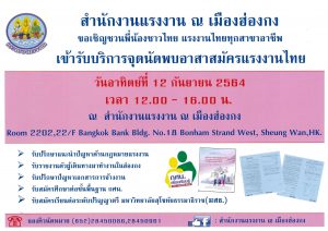ขอเชิญพี่น้องชาวไทย แรงงานไทยทุกสาขาอาชีพ เข้ารับบริการจุดนัดพบอาสาสมัครแรงงานไทย วันอาทิตย์ที่ 12 กันยายน 2564 เวลา 12.00-16.00 น. ณ สำนักงานแรงงาน ณ เมืองฮ่องกง