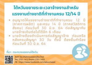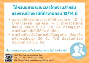 กรง. ไต้หวัน ประกาศขยายสัญญาจ้างสำหรับแรงงานต่างชาติที่ทำงานครบ 12/14 ปี