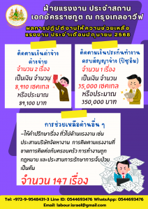 ผลการปฏิบัติงานให้ความช่วยเหลือแรงงาน ประจำเดือนมิถุนายน 2568 ของฝ่ายแรงงาน ประจำสถานเอกอัครราชทูต ณ กรุงเทลอาวีฟ