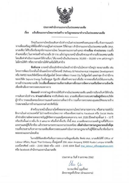 ประกาศสำนักงานแรงงานในประเทศมาเลเซีย เรื่อง แจ้งเตือนแรงงานไทยภาคก่อสร้าง ระวังถูกหลอกมาทำงานในประเทศมาเลเซีย