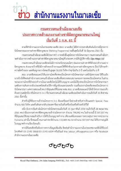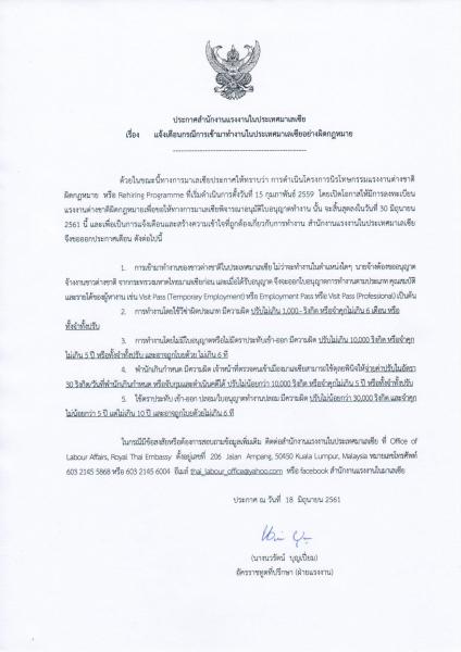 ประกาศสำนักงานแรงงานในประเทศมาเลเซีย เรื่อง แจ้งเตือนกรณีการเข้ามาทำงานในประเทศมาเลเซียอย่างผิดกฎหมาย