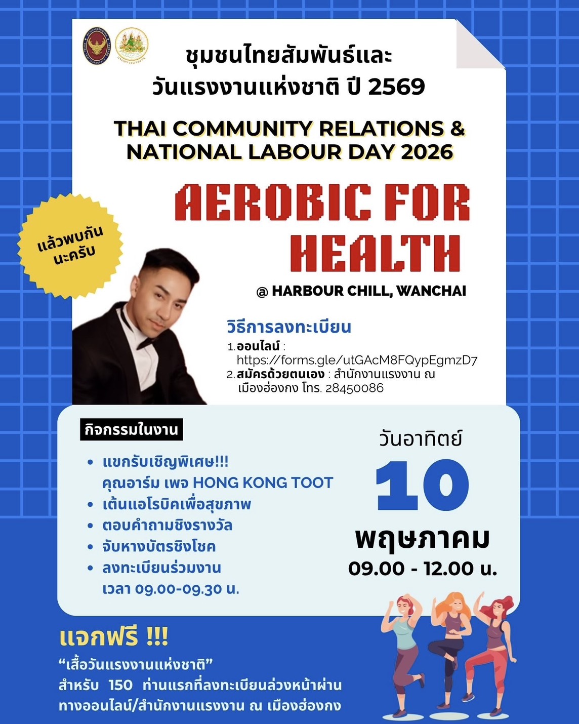 ขอเชิญชวนพี่น้องชาวไทยในเขตบริหารพิเศษฮ่องกงและเขตบริหารพิเศษมาเก๊าทุกท่าน ร่วมงาน “ชุมชนไทยสัมพันธ์และวันแรงงานแห่งชาติ ปี 2569” Thai Community Relations & National Labour day ในวันอาทิตย์ที่ 10 พฤษภาคม 2569 สถานที่ : Harbour Chill,Wanchai แจกฟรี !!! “เสื้อวันแรงงานแห่งชาติ”👕 สำหรับ 150 ท่านแรก ที่ลงทะเบียนล่วงหน้าผ่านทางออนไลน์/สำนักงานแรงงาน ณ เมืองฮ่องกง 📌วิธีการลงทะเบียน📌 1.ออนไลน์ : https://forms.gle/utGAcM8FQypEgmzD7 2. สมัครด้วยตนเอง : สำนักงานแรงงาน ณ เมืองฮ่องกง โทร. 28450086