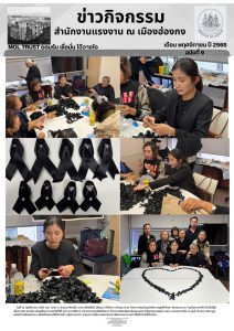 สำนักแรงงาน ณ เมืองฮ่องกง ร่วมกิจกรรมทำโบว์ริบบิ้นสีดำ เพื่อถวายความอาลัย แด่สมเด็จพระนางเจ้าสิริกิติ์ พระบรมราชินีนาถ พระบรมราชชนนีพันปีหลวง กับสมาคมรวมไทยในฮ่องกง และอาสาสมัคร อพม. ฮ่องกง ณ ศูนย์ Dream เขตเกาลูน
