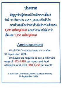รัฐบาลฮ่องกง ปรับอัตราค่าจ้างสัญญาจ้างผู้ช่วยแม่บ้านที่ลงนามตั้งแต่ วันที่ 30 กันยายน 2567 (2024) เป็นต้นไป ค่าจ้างไม่ต่ำกว่าเดือนละ 4,990 เหรียญฮ่องกง และค่าอาหารไม่ต่ำกว่าเดือนละ 1,236 เหรียญฮ่องกง
