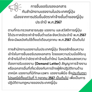 การยื่นขอรับรองเอกสาร กับสำนักงานแรงงานในประเทศญี่ปุ่น เนื่องจากการปรับขึ้นอัตราค่าจ้างขั้นต่ำของญี่ปุ่นประจำปี พ.ศ.2567