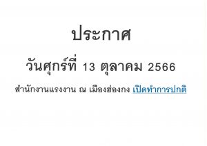 ประกาศ วันศุกร์ที่ 13 ตุลาคม 2566 สำนักงานแรงงาน ณ เมืองฮ่องกง “เปิดทำการปกติ”