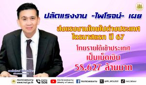 ปลัดแรงงาน “ไพโรจน์” เผยส่งแรงงานไทยไปต่างประเทศไตรมาสแรก ปี 67 โกยรายได้เข้าประเทศเป็นเม็ดเงิน 58,627 ล้านบาท