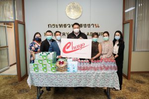ก.แรงงาน รับมอบหน้ากากอนามัยและเจลแอลกอฮอล์จาก บริษัท ชโย ให้กระทรวงแรงงานนำไปมอบบุคลากรทางการแพทย์สู้โควิด-19