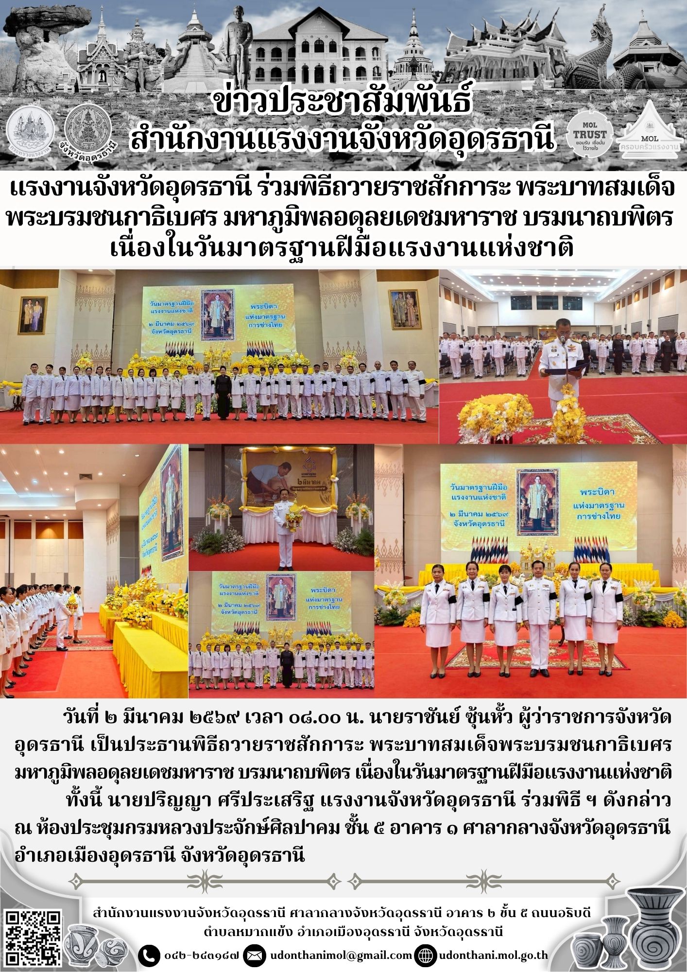 แรงงานจังหวัดอุดรธานี ร่วมพิธีถวายราชสักการะพระบาทสมเด็จ พระบรมชนกาธิเบศร มหาภูมิพลอดุลยเดชมหาราช บรมนาถบพิตร เนื่องในวันมาตรฐานฝีมือแรงงานแห่งชาติ