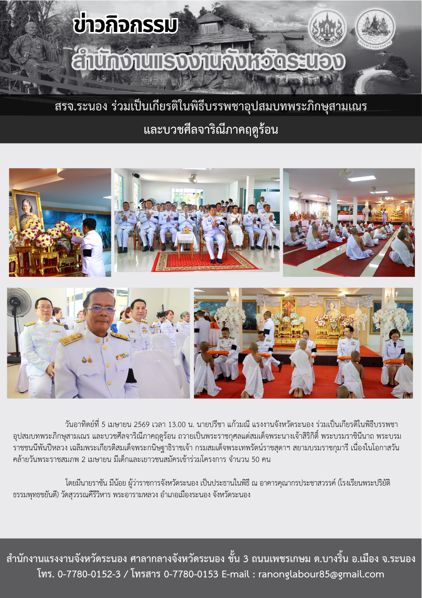 สรจ.ระนองร่วมเป็นเกียรติในพิธีบรรพชาอุปสมบทพระภิกษุสามเณรและบวชศีลจาริณีภาคฤดูร้อน