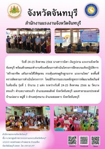 สรจ.จันทบุรี พร้อมด้วยคณะทำงานขับเคลื่อนการดำเนินโครงการฝึกอบรมเชิงปฏิบัติการ “สร้างอาชีพ เสริมรายได้ให้ชุมชน กระตุ้นเศรษฐกิจฐานราก แรงงานไทย” ลงพื้นที่ตรวจติดตามการดำเนินโครงการฯ โดยมีกิจกรรมอบรมหลักสูตรการพัฒนาผลิตภัณฑ์ในท้องถิ่น รุ่นที่ 1 จำนวน 2 แห่ง