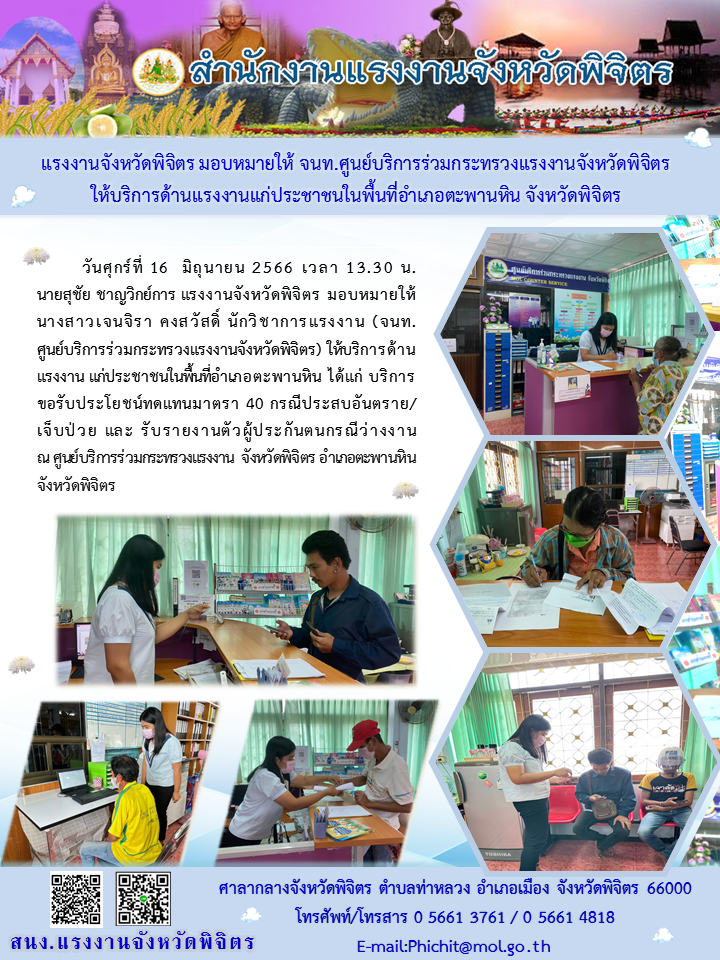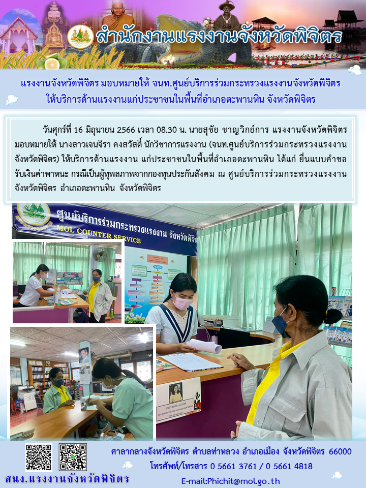 จนท.ศูนย์บริการร่วมกระทรวงแรงงานจังหวัดพิจิตร ให้บริการด้านแรงงานแก่ประชาชนในพื้นที่อำเภอตะพานหิน จังหวัดพิจิตร