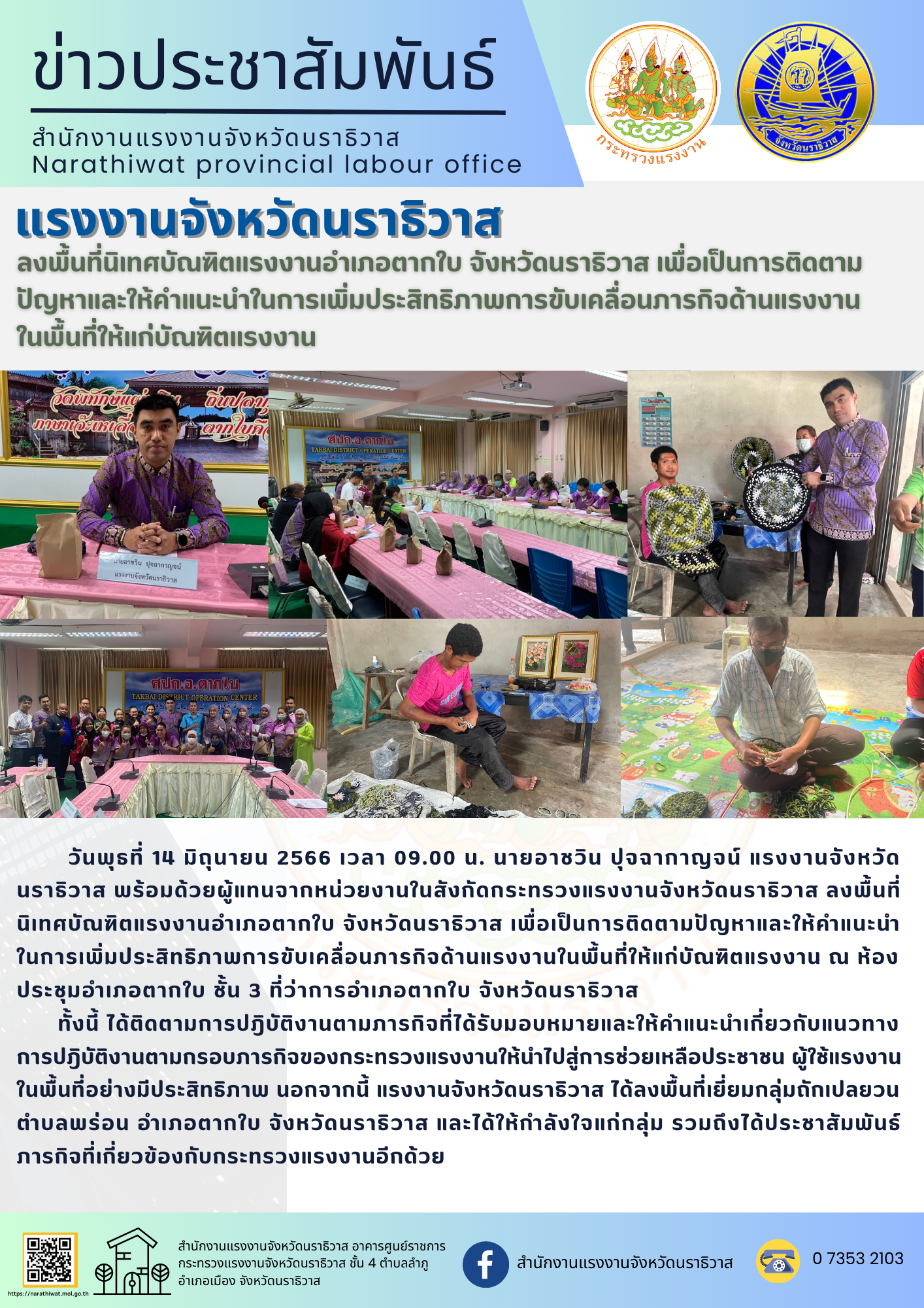 สรจ.นราธิวาส ลงพื้นที่นิเทศบัณฑิตแรงงานอำเภอตากใบ จังหวัดนราธิวาส เพื่อเป็นการติดตามปัญหาและให้คำแนะนำในการเพิ่มประสิทธิภาพการขับเคลื่อนภารกิจด้านแรงงาน ในพื้นที่ให้แก่บัณฑิตแรงงาน