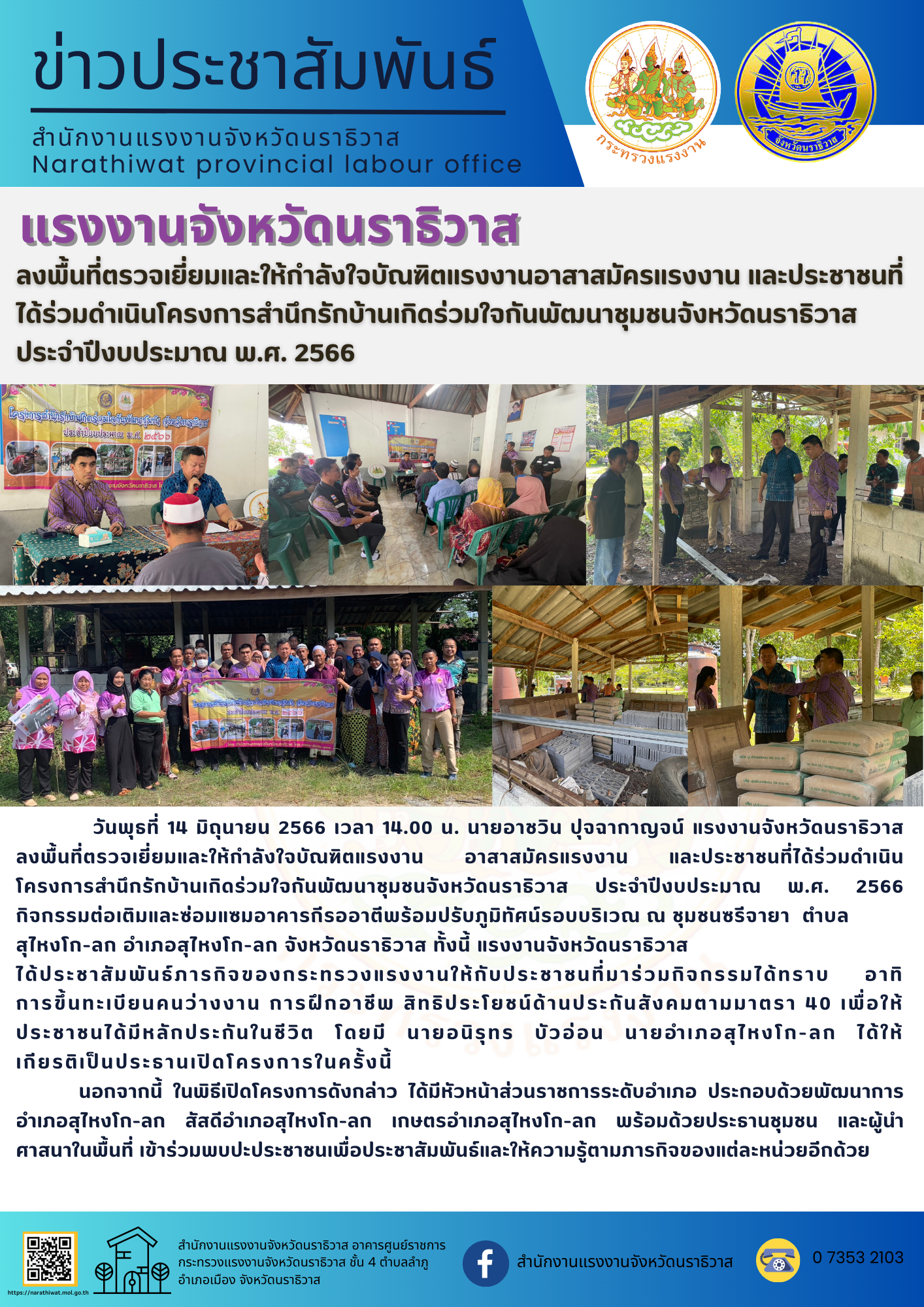 สรจ.นราธิวาส ลงพื้นที่ตรวจเยี่ยมและให้กำลังใจบัณฑิตแรงงานอาสาสมัครแรงงาน และประชาชนที่ได้ร่วมดำเนินโครงการสำนึกรักบ้านเกิดร่วมใจกันพัฒนาชุมชนจังหวัดนราธิวาส ประจำปีงบประมาณ พ.ศ. 2566