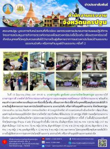 สรจ.นครปฐม บูรณาการกับหน่วยงานที่เกี่ยวข้อง ออกตรวจสถานประกอบการตามแผนปฏิบัติการโครงการสนับสนุนภารกิจการตรวจคัดกรองเพื่อแสวงหาข้อบ่งชี้เบื้องต้น เพื่อแสวงหาข้อบ่งชี้สำหรับบุคคลที่มีเหตุอันควรสงสัยได้ว่าอาจเป็นผู้เสียหายจากการแสวงหาประโยชน์ด้านแรงงาน แรงงานบังคับ หรือการค้ามนุษย์ด้านแรงงาน ครั้งที่ 2