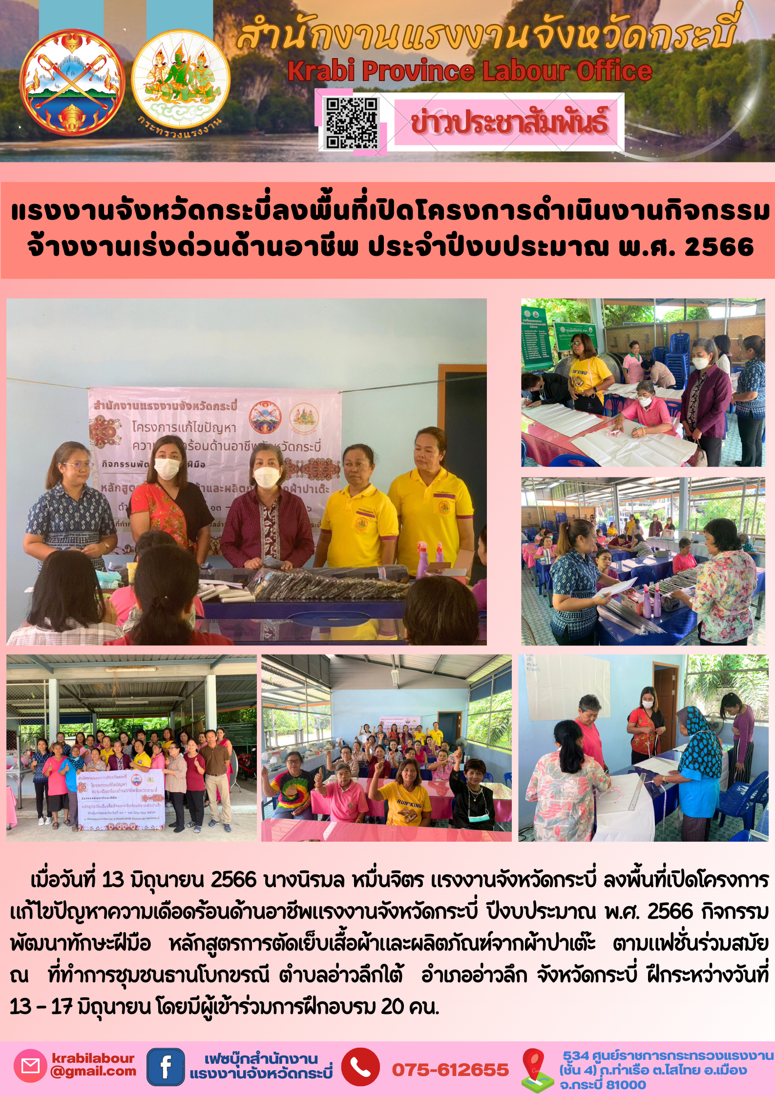 สรจ.กระบี่ ลงพื้นที่เปิดโครงการดำเนินงานกิจกรรมจ้างงานเร่งด่วนด้านอาชีพ ประจำปีงบประมาณ พ.ศ. 2566
