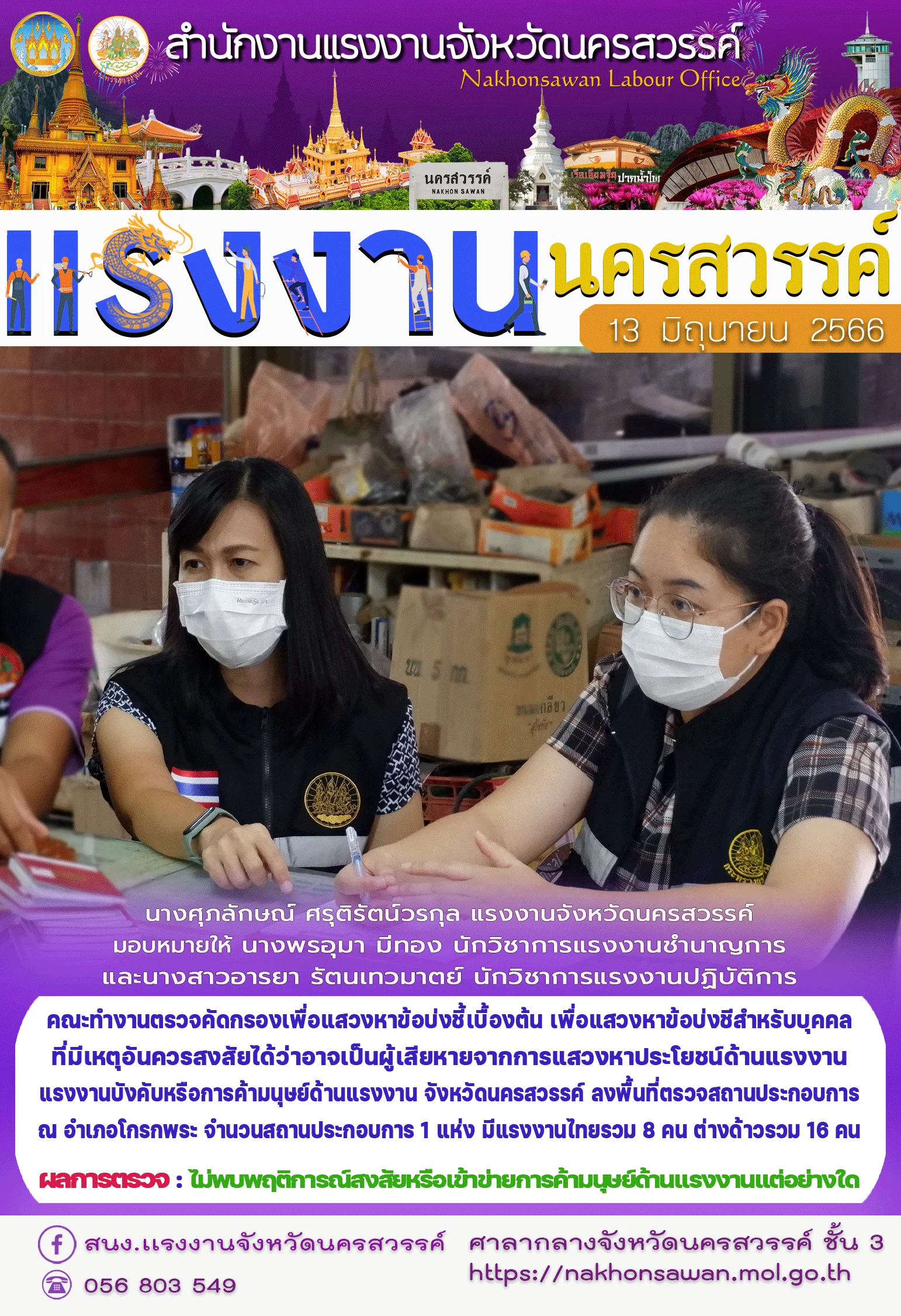 สรจ.นครสวรรค์ คณะทำงานตรวจคัดกรองเพื่อแสวงหาข้อบ่งชี้เบื้องต้น เพื่อแสวงหาข้อบ่งชีสำหรับบุคคล ที่มีเหตุอันควรสงสัยได้ว่าอาจเป็นผู้เสียหายจากการแสวงหาประโยชน์ด้านแรงงาน แรงงานบังคับหรือการค้ามนุษย์ด้านแรงงาน จังหวัดนครสวรรค์ ลงพื้นที่ตรวจสถานประกอบการ