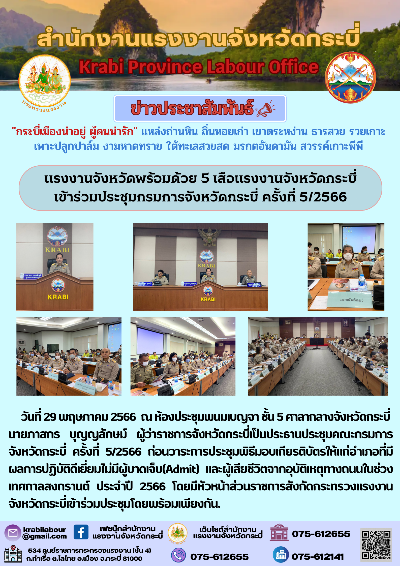 แรงงานจังหวัดพร้อมด้วย 5 เสือแรงงานจังหวัดกระบี่ เข้าร่วมประชุมกรมการจังหวัดกระบี่ ครั้งที่ 5/2566