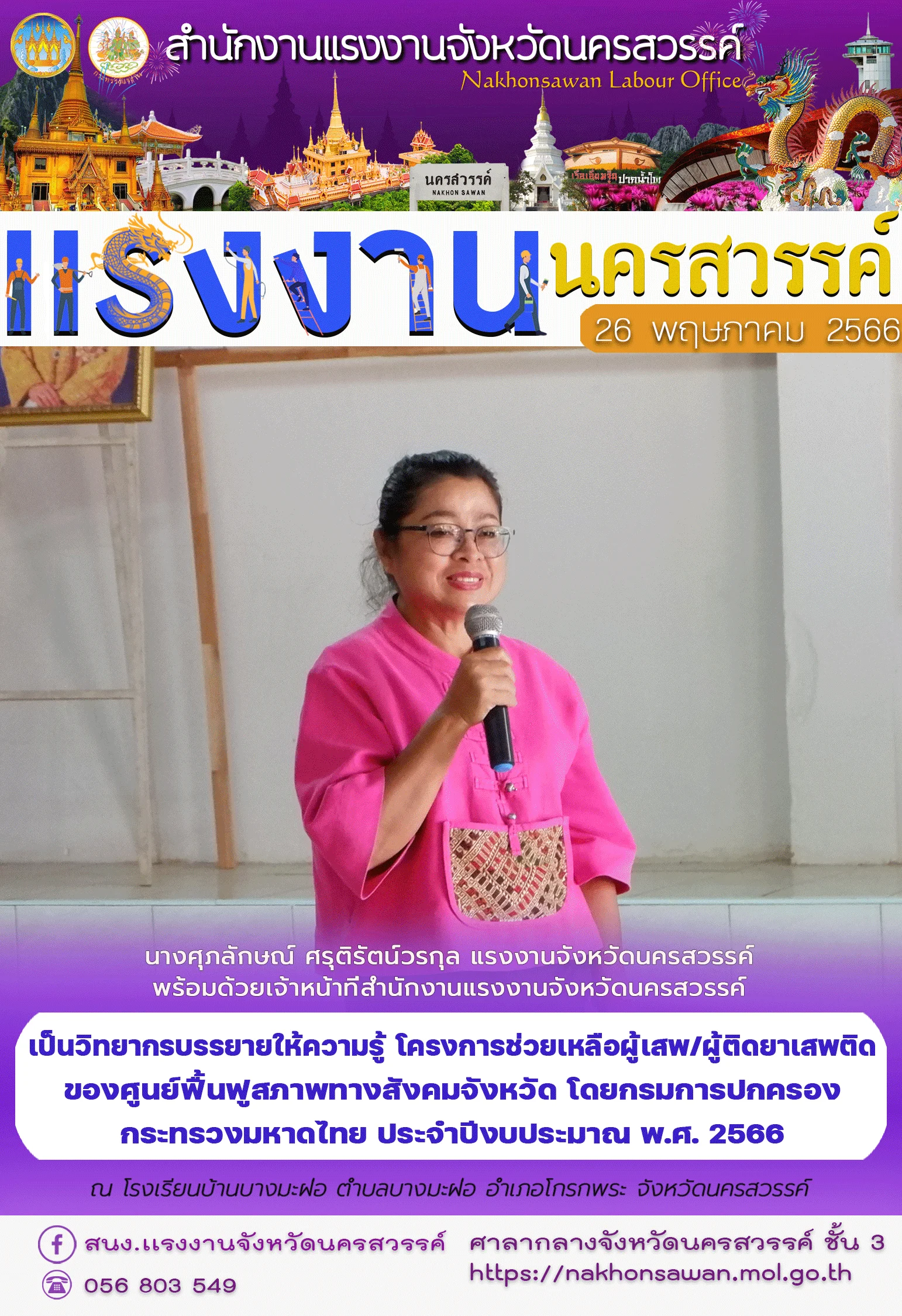 สรจ.นครสวรรค์ เป็นวิทยากรบรรยายให้ความรู้ โครงการช่วยเหลือผู้เสพ/ผู้ติดยาเสพติด ของศูนย์ฟื้นฟูสภาพทางสังคมจังหวัด โดยกรมการปกครอง กระทรวงมหาดไทย ประจำปีงบประมาณ พ.ศ. 2566