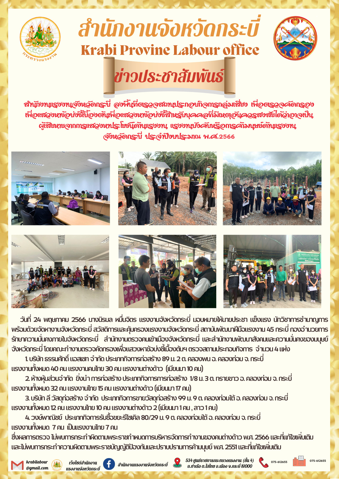 สรจ.กระบี่ ลงพื้นที่ตรวจสถานประกอบกิจการกลุ่มเสี่ยง เพื่อตรวจคัดกรอง เพื่อแสวงหาข้อบ่งชี้เบื้องต้นเพื่อแสวงหาข้อบ่งชี้สำหรับบุคคลที่มีเหตุอันควรสงสัยได้ว่าอาจเป็น ผู้เสียหายจากการแสวงหาประโยชน์ด้านแรงงาน แรงงานบังคับหรือการค้ามนุษย์ด้านแรงงาน จังหวัดกระบี่ ประจำปีงบประมาณ พ.ศ.2566