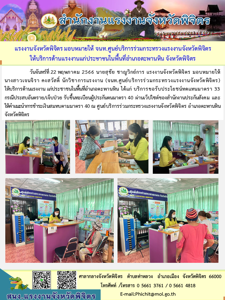 เจ้าหน้าที่ ศูนย์บริการร่วมกระทรวงแรงงานจังหวัดพิจิตร ให้บริการด้านแรงงานแก่ประชาชนในพื้นที่อำเภอตะพานหิน จังหวัดพิจิตร