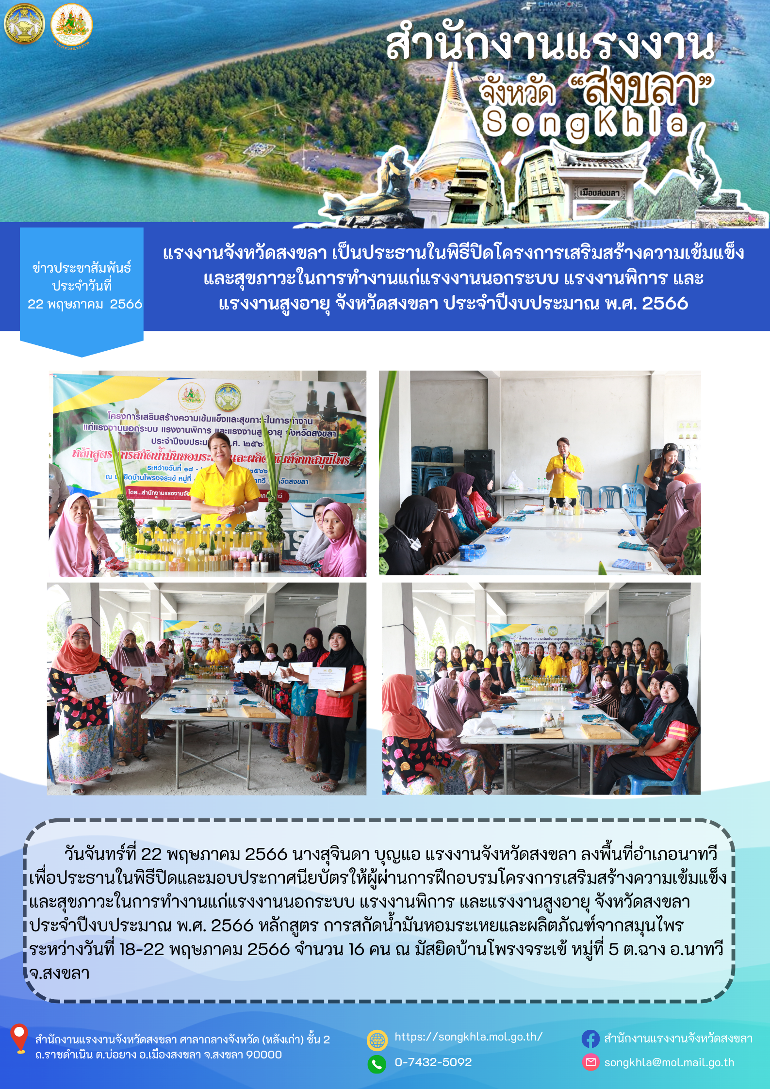 สรจ.สงขลา ลงพื้นที่อำเภอนาทวี เพื่อเป็นประธานในพิธีปิดและมอบประกาศนียบัตรให้ผู้ผ่านการฝึกอบรมโครงการเสริมสร้างความเข้มแข็งและสุขภาวะในการทำงานแก่แรงงานนอกระบบ แรงงานพิการ และแรงงานสูงอายุ จังหวัดสงขลา ประจำปีงบประมาณ พ.ศ. 2566