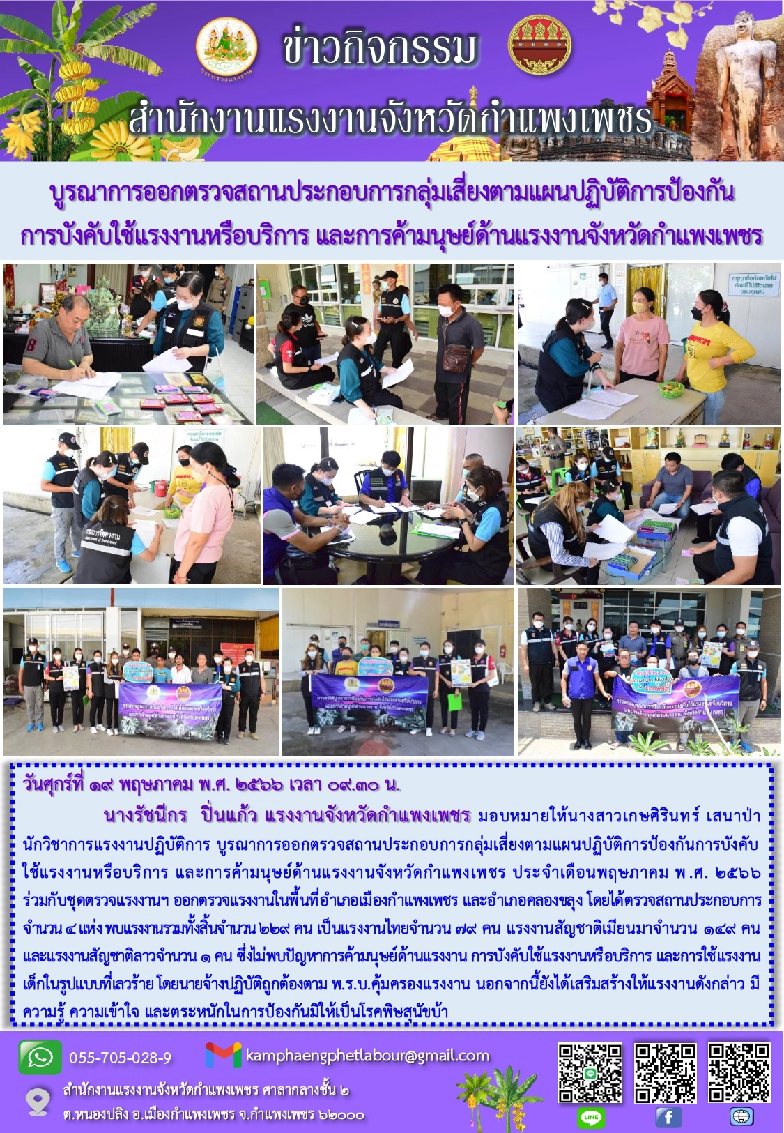 บูรณาการออกตรวจสถานประกอบการกลุ่มเสี่ยงตามแผนปฏิบัติการป้องกันการบังคับใช้แรงงานหรือบริการ และการค้ามนุษย์ด้านแรงงานจังหวัดกำแพงเพชร