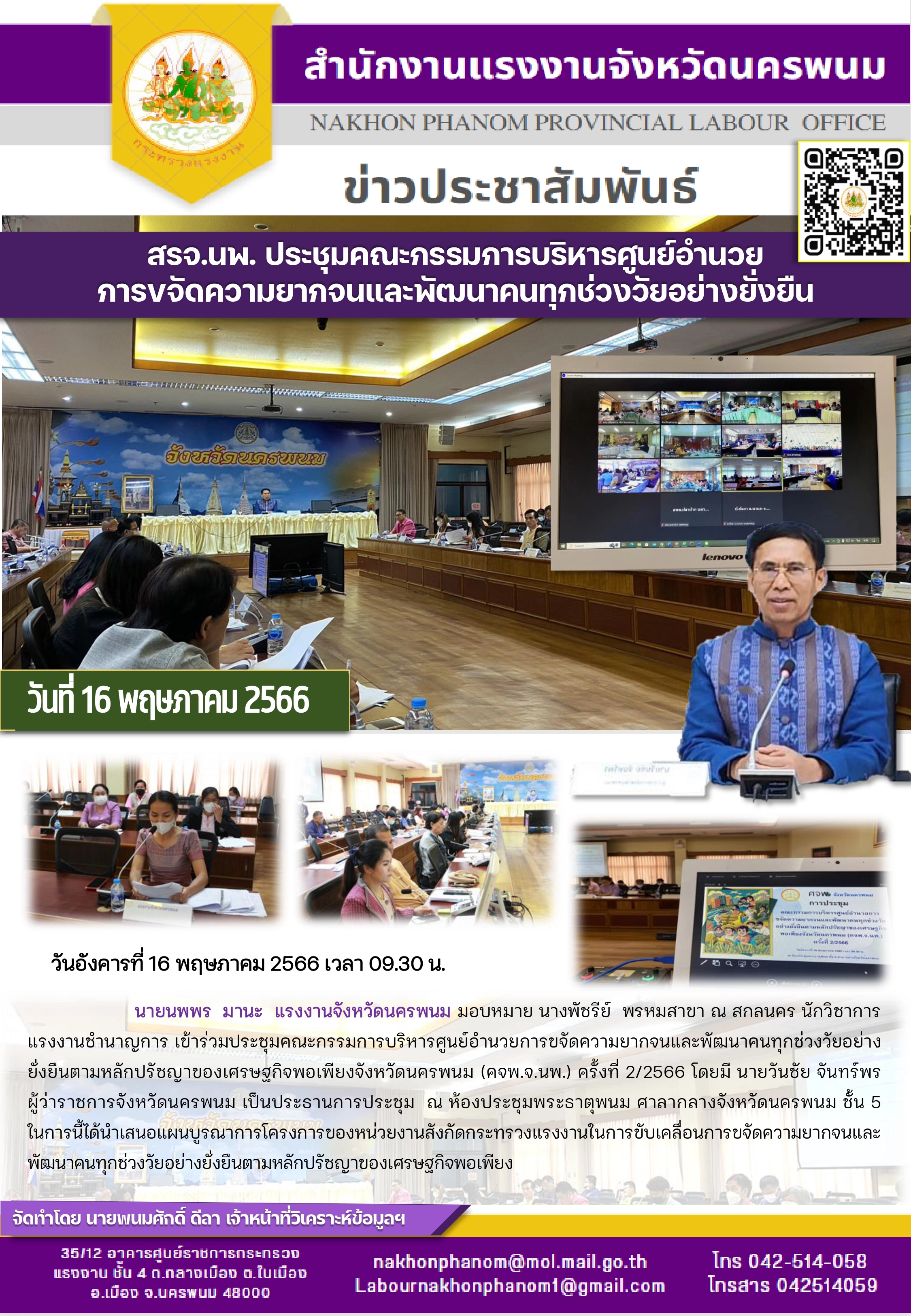 สรจ.นครพนม เข้าร่วมประชุมคณะกรรมการบริหารศูนย์อำนวยการขจัดความยากจนและพัฒนาคนทุกช่วงวัยอย่างยั่งยืนตามหลักปรัชญาของเศรษฐกิจพอเพียงจังหวัดนครพนม (คจพ.จ.นพ.) ครั้งที่ 2/2566