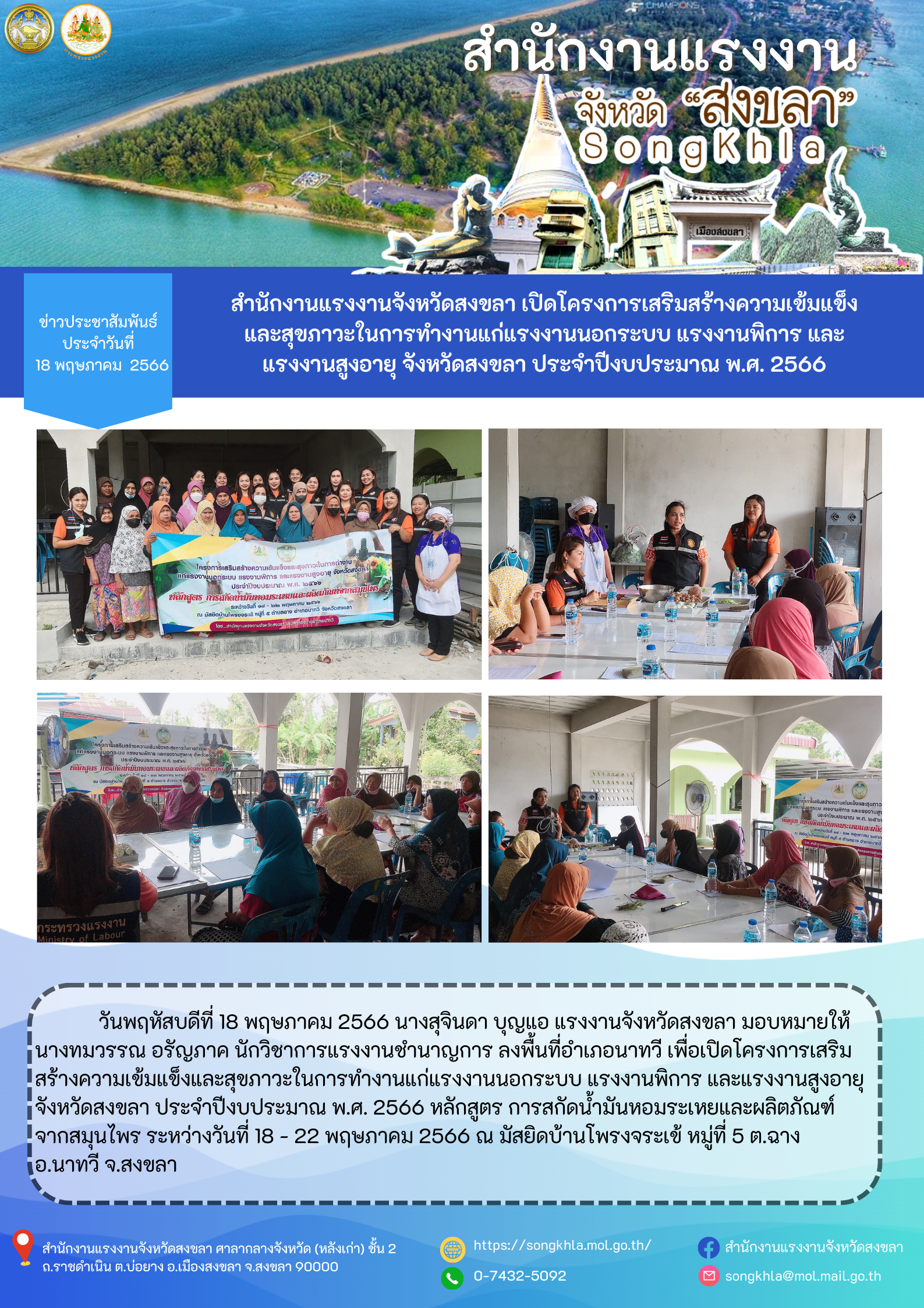 สรจ.สงขลา เปิดโครงการเสริมสร้างความเข้มแข็งและสุขภาวะในการทำงานแก่แรงงานนอกระบบ แรงงานพิการ และแรงงานสูงอายุ จังหวัดสงขลา ประจำปีงบประมาณ พ.ศ. 2566