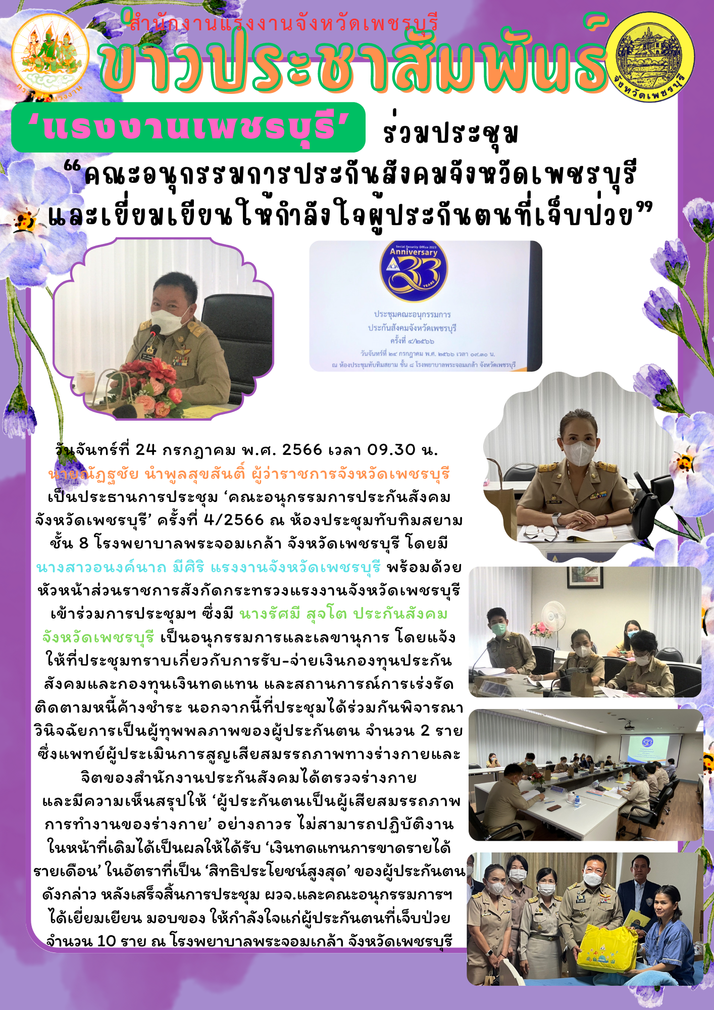 สรจ.เพชรบุรี’ ร่วมประชุม “คณะอนุกรรมการประกันสังคมจังหวัดเพชรบุรี และเยี่ยมเยียนให้กำลังใจผู้ประกันตนที่เจ็บป่วย”