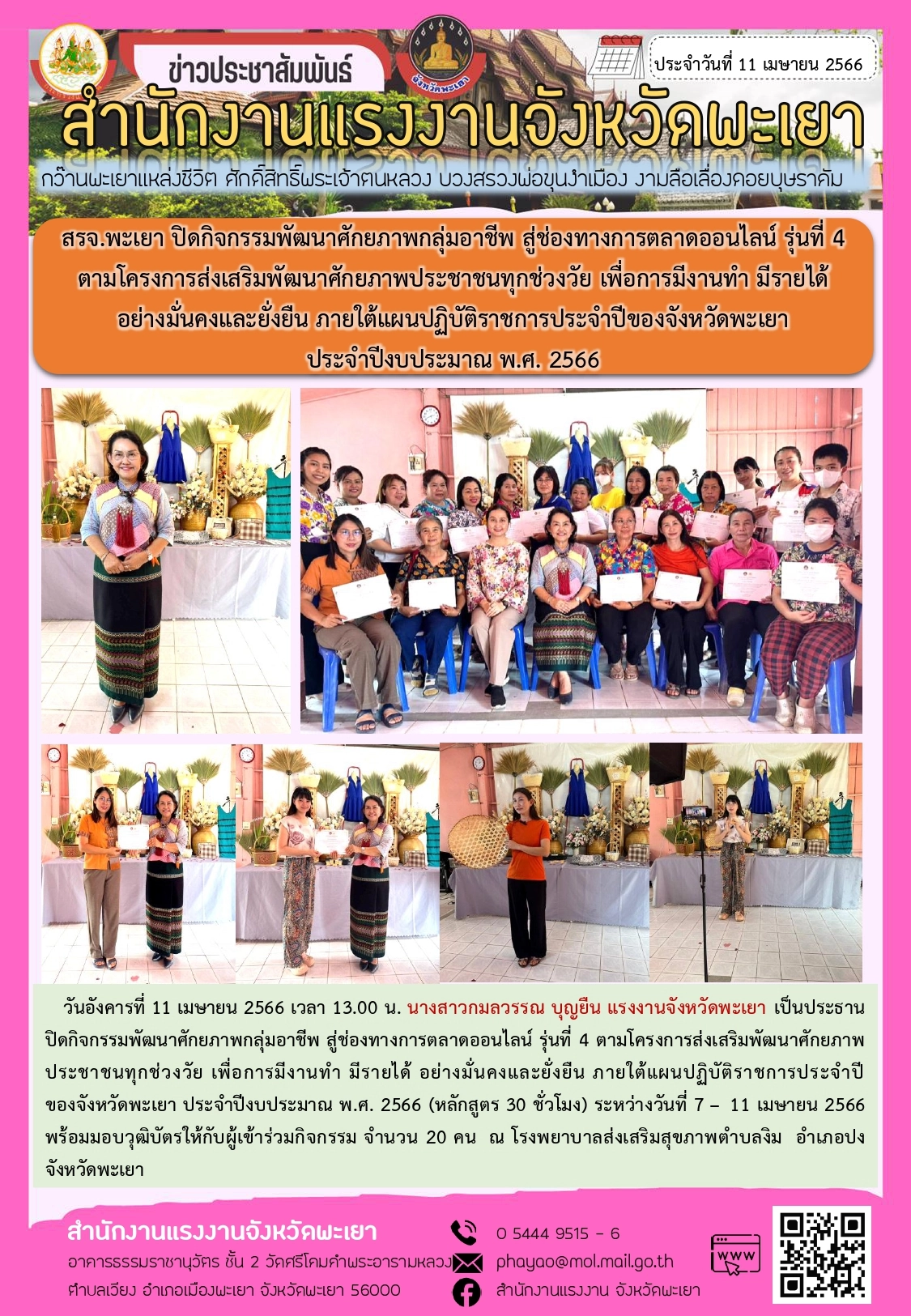 สรจ.พะเยา ปิดกิจกรรมพัฒนาศักยภาพกลุ่มอาชีพ สู่ช่องทางการตลาดออนไลน์ รุ่นที่ 4 ตามโครงการส่งเสริมพัฒนาศักยภาพประชาชนทุกช่วงวัย เพื่อการมีงานทำ มีรายได้ อย่างมั่นคงและยั่งยืน ภายใต้แผนปฏิบัติราชการประจำปีของจังหวัดพะเยา ประจำปีงบประมาณ พ.ศ. 2566