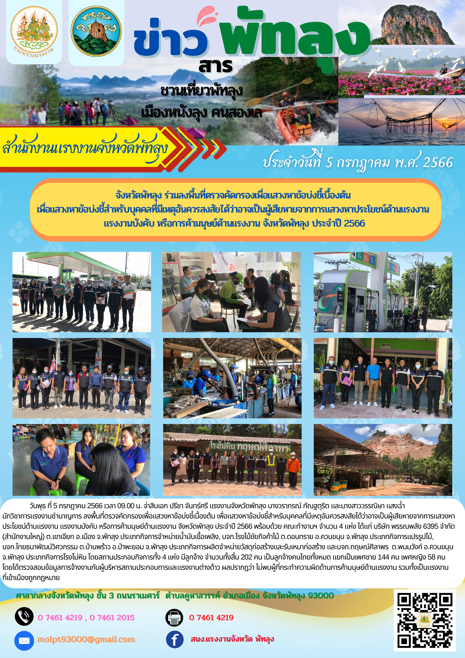 สรจ.พัทลุง ร่วมลงพื้นที่ตรวจคัดกรองเพื่อแสวงหาข้อบ่งชี้เบื้องต้น เพื่อแสวงหาข้อบ่งชี้สำหรับบุคคลที่มีเหตุอันควรสงสัยได้ว่าอาจเป็นผู้เสียหายจากการแสวงหาประโยชน์ด้านแรงงาน แรงงานบังคับ หรือการค้ามนุษย์ด้านแรงงาน จังหวัดพัทลุง ประจำปี 2566