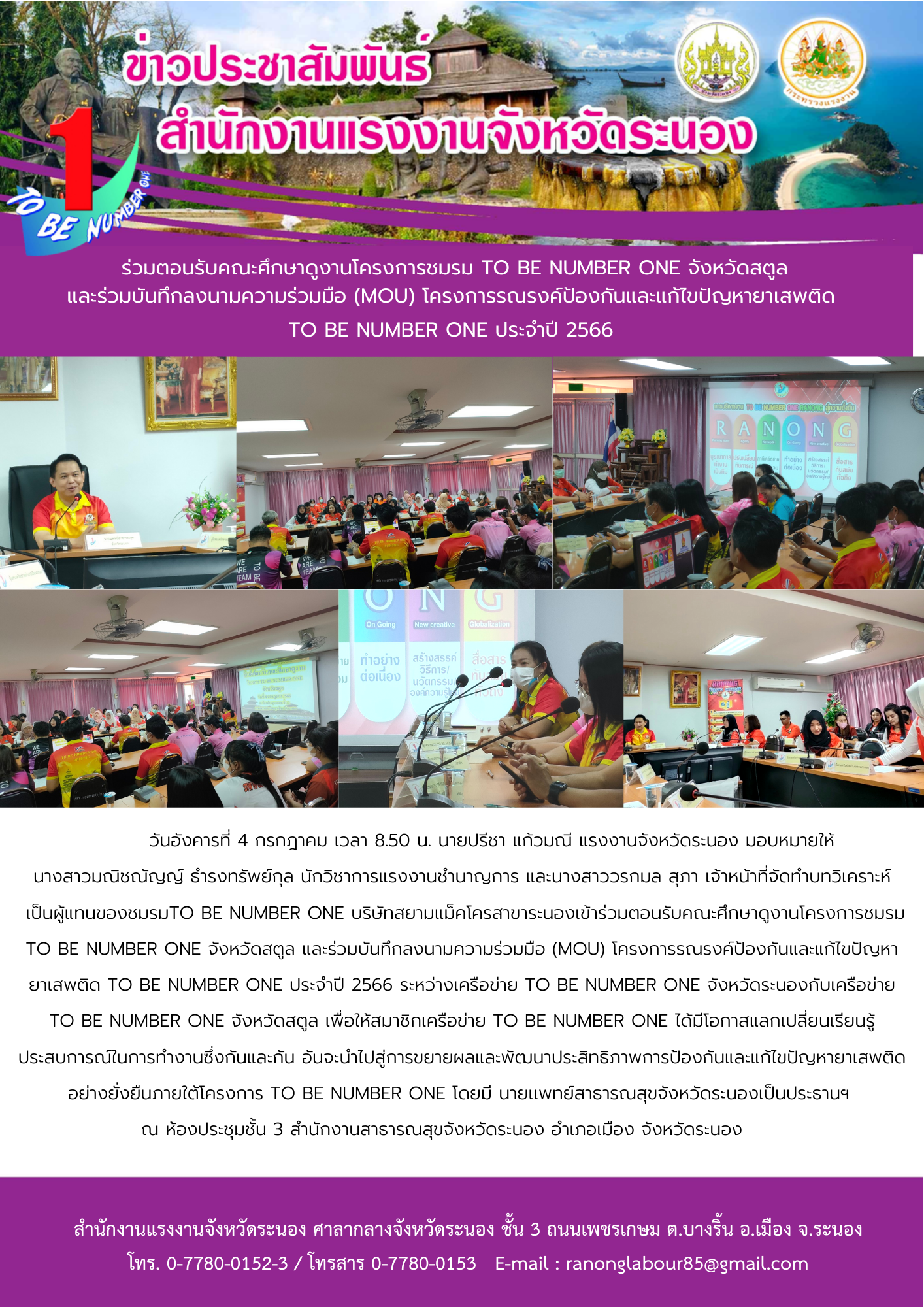สรจ.ระนอง ร่วมตอนรับคณะศึกษาดูงานโครงการชมรม TO BE NUMBER ONE จังหวัดสตูล และร่วมบันทึกลงนามความร่วมมือ (MOU) โครงการรณรงค์ป้องกันและแก้ไขปัญหายาเสพติด TO BE NUMBER ONE ประจำปี 2566